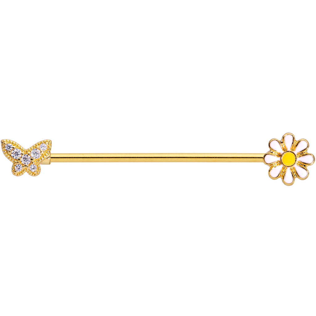 14G Clear Gem Gold Tone Butterfly Daisy `Industrial Barbell 38mm