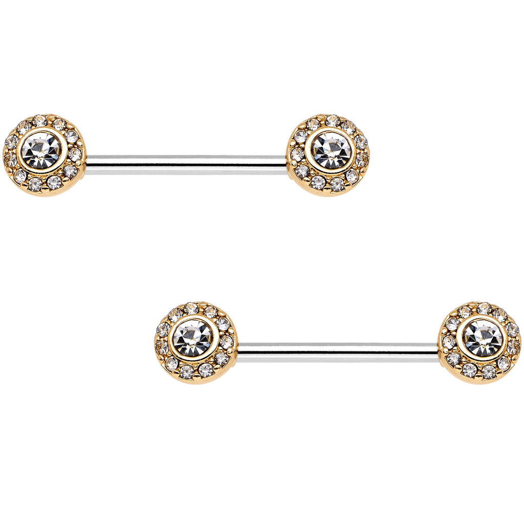 Clear Gem Gold Tone Circular Cluster Barbell Nipple Ring Set
