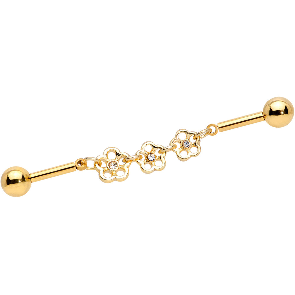 Why stop and smell the flowers when you can wear them in your industrial piercing with this 14 gauge helix barbell? It's made with two 3/8" gold tone PVD over 316L surgical grade stainless steel barbells with 5mm ball ends, for a total length of 1 9/16". The central focus consists of a trio of three flowers charm with a retro, looping style and feature clear gems at their centers. Let beauty blossom and flowers frolic in your industrial piercing with this uniquely styled botanical barbell earring!