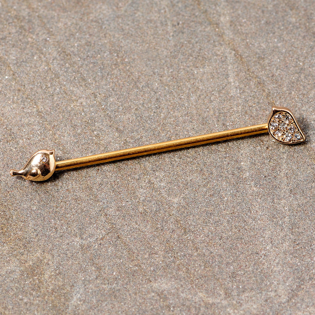 These little birds are looking for a place to perch...why not your helix piercings? This 14 gauge barbell earring is made with a 1 1/2" gold tone PVD over 316L surgical grade stainless steel straight barbell. One end features a simply stylized bird charm end with a clear gem eye and elegantly understated detailing. The other is a perching bird charm end, completely paved with small clear gems and providing balance and contrast to the piece. You'll love having these birds nest in your industrial piercing!Specifications