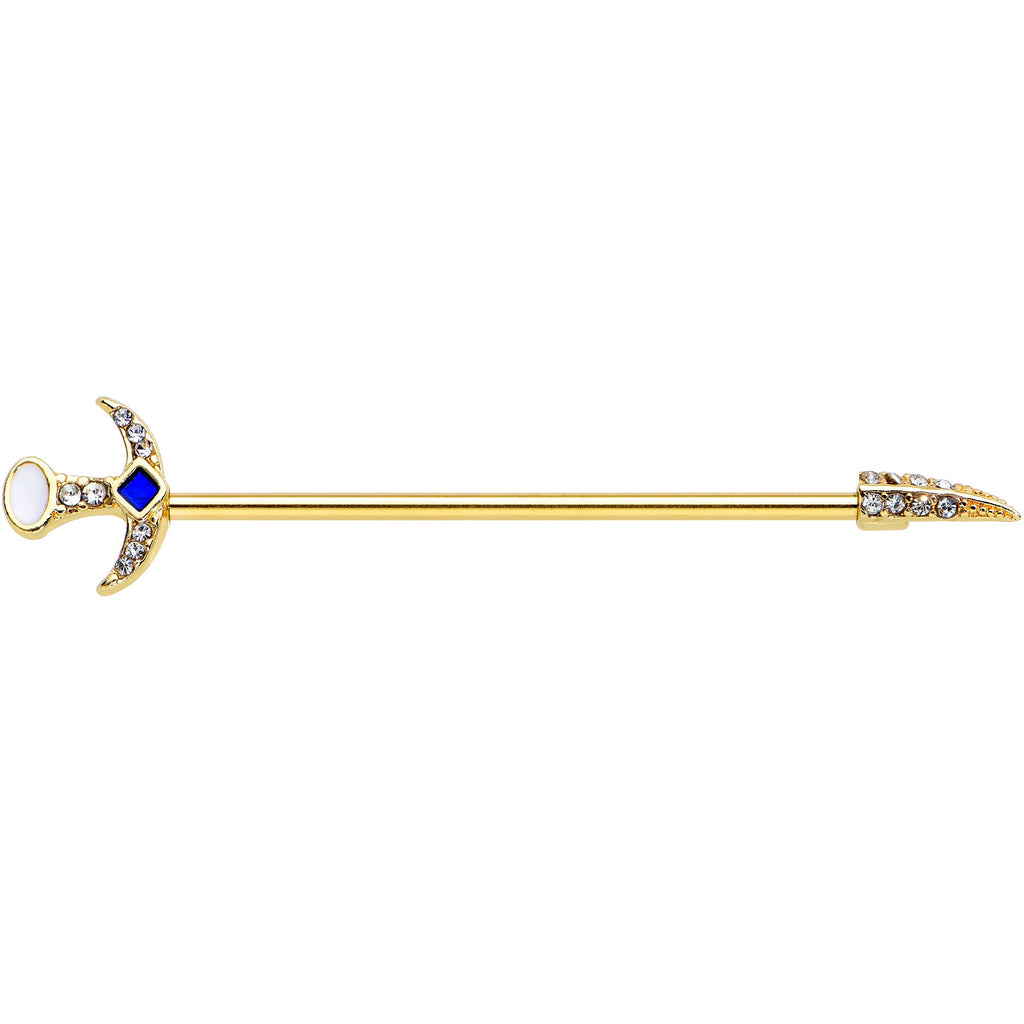 You're sure to look sharp in this 14 gauge helix barbell. It's made with a 1 1/2" gold tone plated over 316L surgical grade stainless steel straight barbell. One end features the sword's sheath, with textured embellishment and set with clear gems. The other end features the handle, paved with more clear gems and set with blue and white embellishments. You don't have to be a master of swordcraft to fall in love with this sabre!Specifications