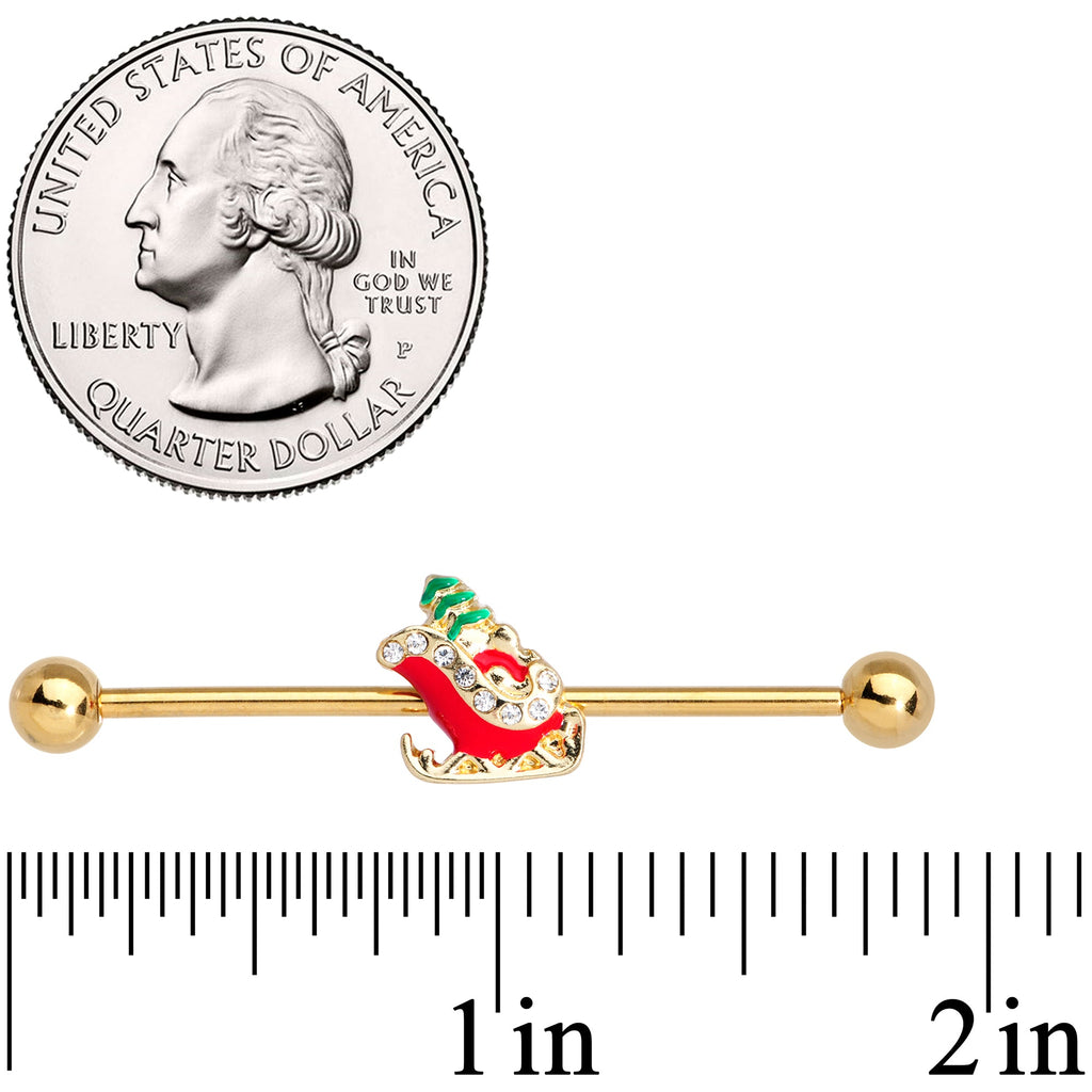 14 Gauge Clear Gem Gold Tone Sleigh Christmas Industrial Barbell 38mm
