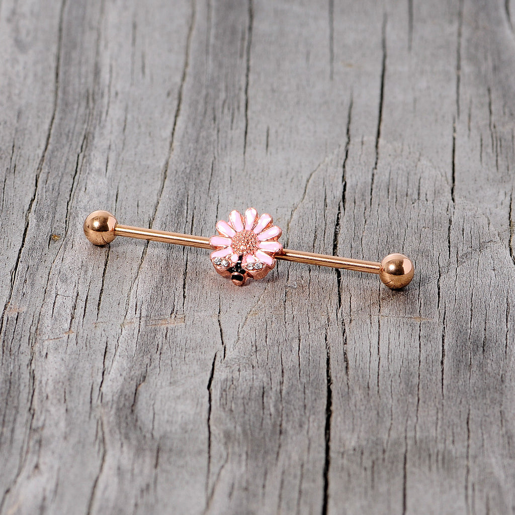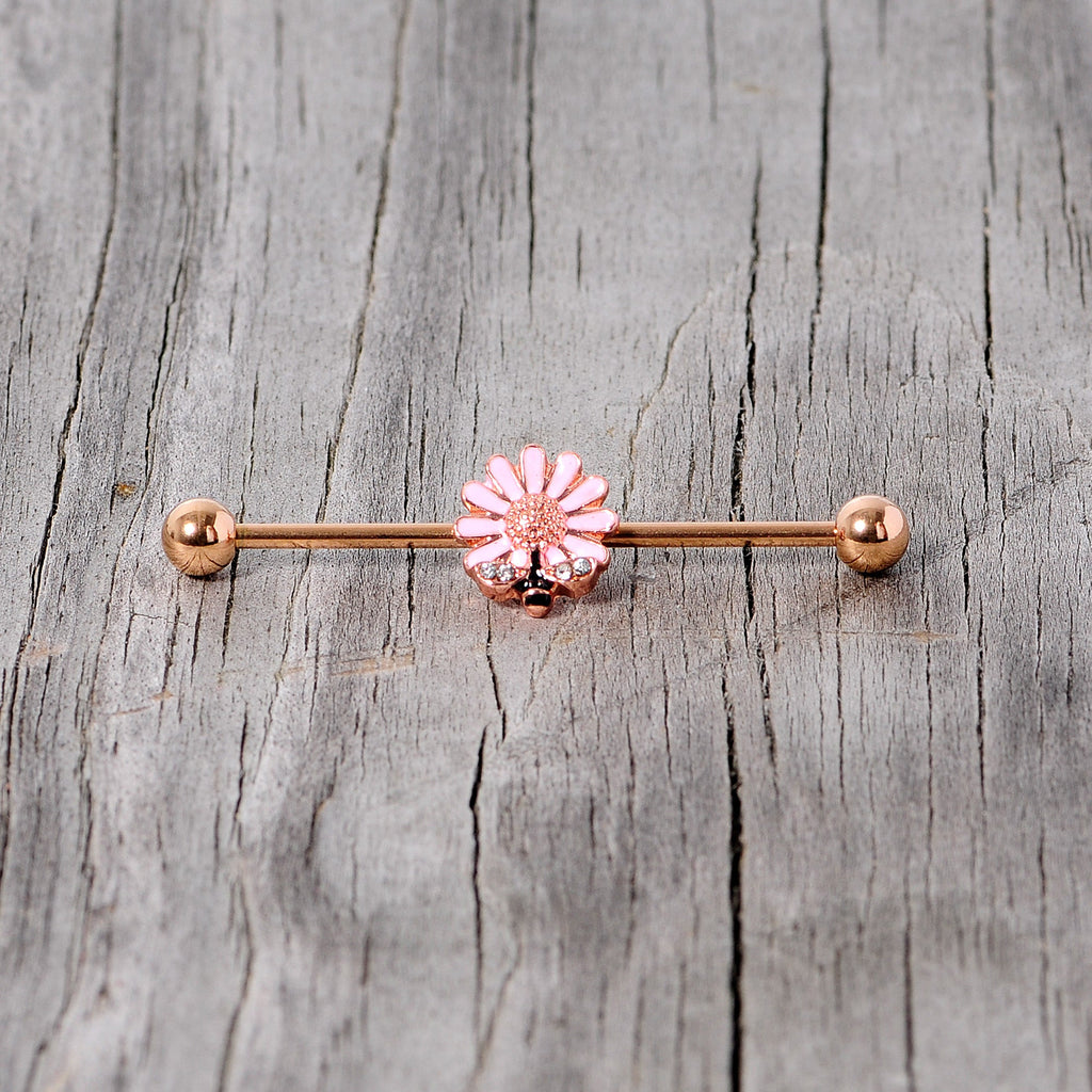 This 14 gauge helix barbell will draw eyes to your piercing like a bee.....to this flower! This barbell earring is made with a 1 1/2" rose gold tone PVD over 316L surgical grade stainless steel straight barbell with 5mm top ball ends and features a moveable pink daisy charm with textured rose gold tone detailing at its center, and which has a small bee perched on it with wings set with clear gems.