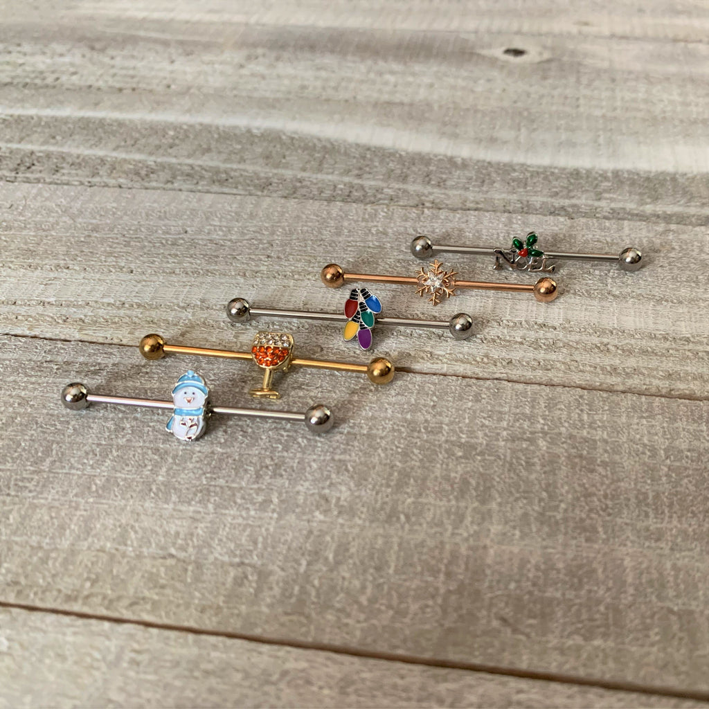 If you can't wait to walk around in a winter wonderland this Christmas season then you will love this 14 gauge industrial earring because it is so cool! Made with a 1 1/2" rose gold tone anodized over 316L surgical grade stainless steel straight barbell, this barbell industrial features a moveable winter snowflake charm set with clear gems. Wishing you happy holidays and tons of winter snow days!