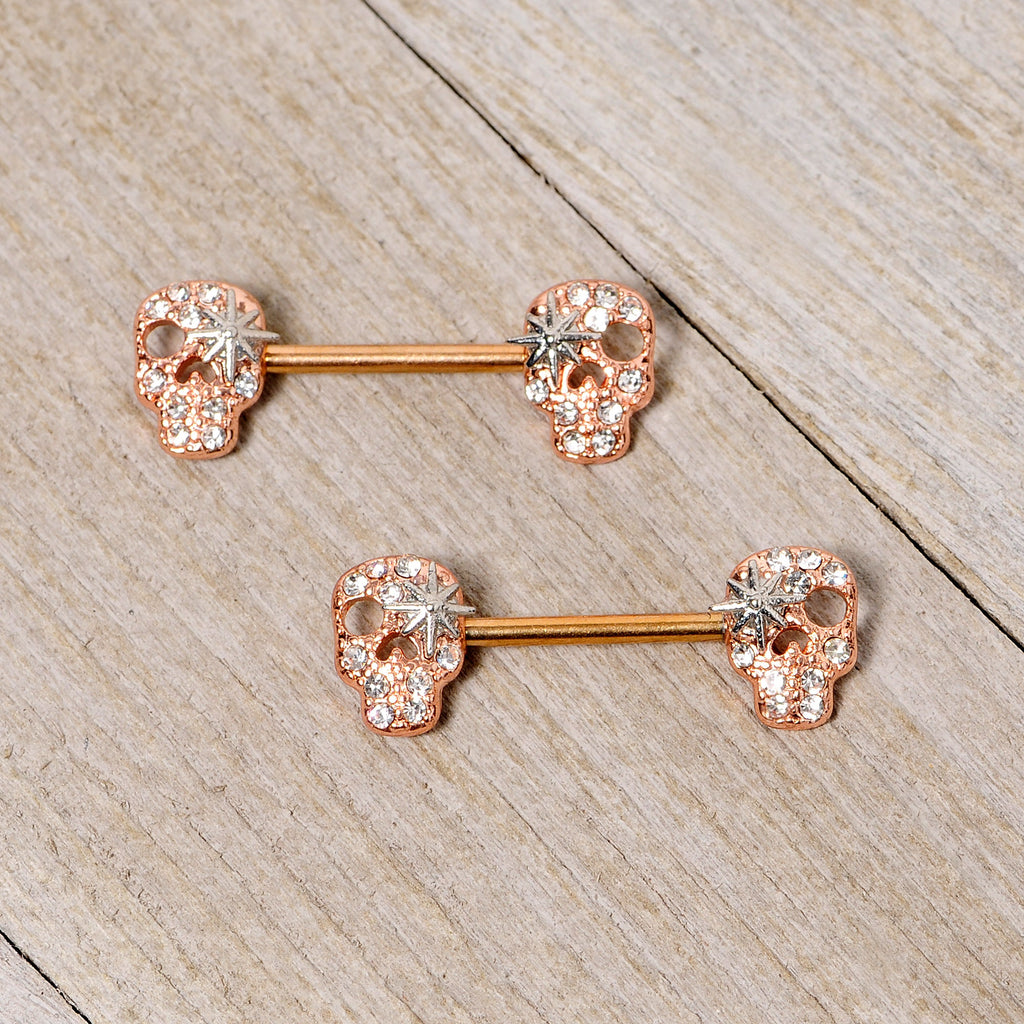 Here are some Halloween skulls with a star in their eyes and a sweet appearance on this 14 gauge nipple jewelry! It's made with 9/16" rose gold tone plated over 316L surgical grade stainless steel straight barbells. The ends feature sweet skull charms with one eye covered by a star and paved in small clear gems. Whenever you choose to wear them, your nipple piercings will feel like stars with our gorgeous skull friends in them! Sold as a set of two.Specifications