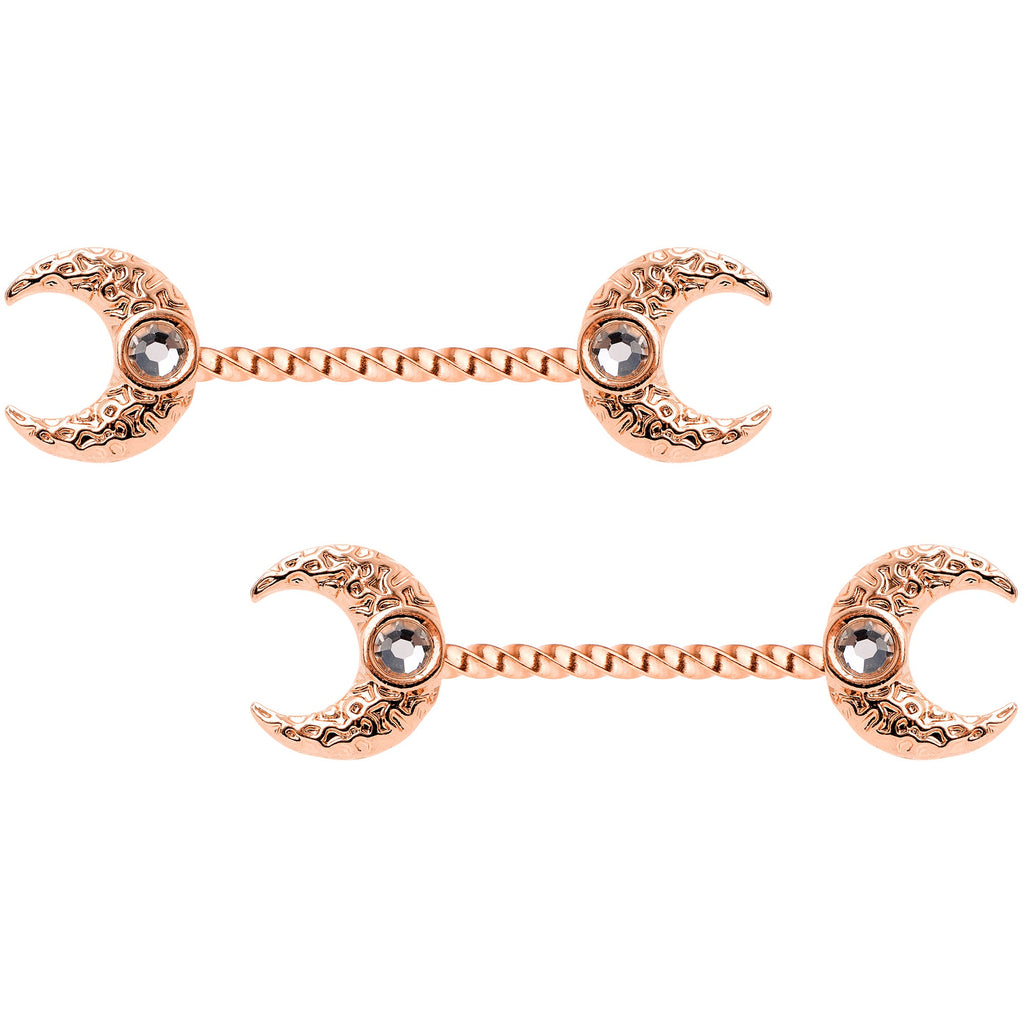 14 Gauge Clear Gem Rose Gold Tone Witch Moon Barbell Nipple Ring Set