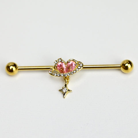 14G Clear Pink Gem Gold Tone Circle Heart Industrial Barbell 38mm
