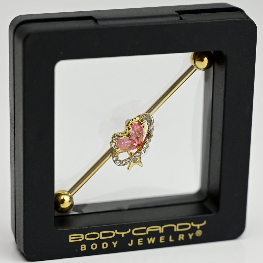 14 Gauge Clear Pink Gem Gold Tone Circle Heart Industrial Barbell 38mm
