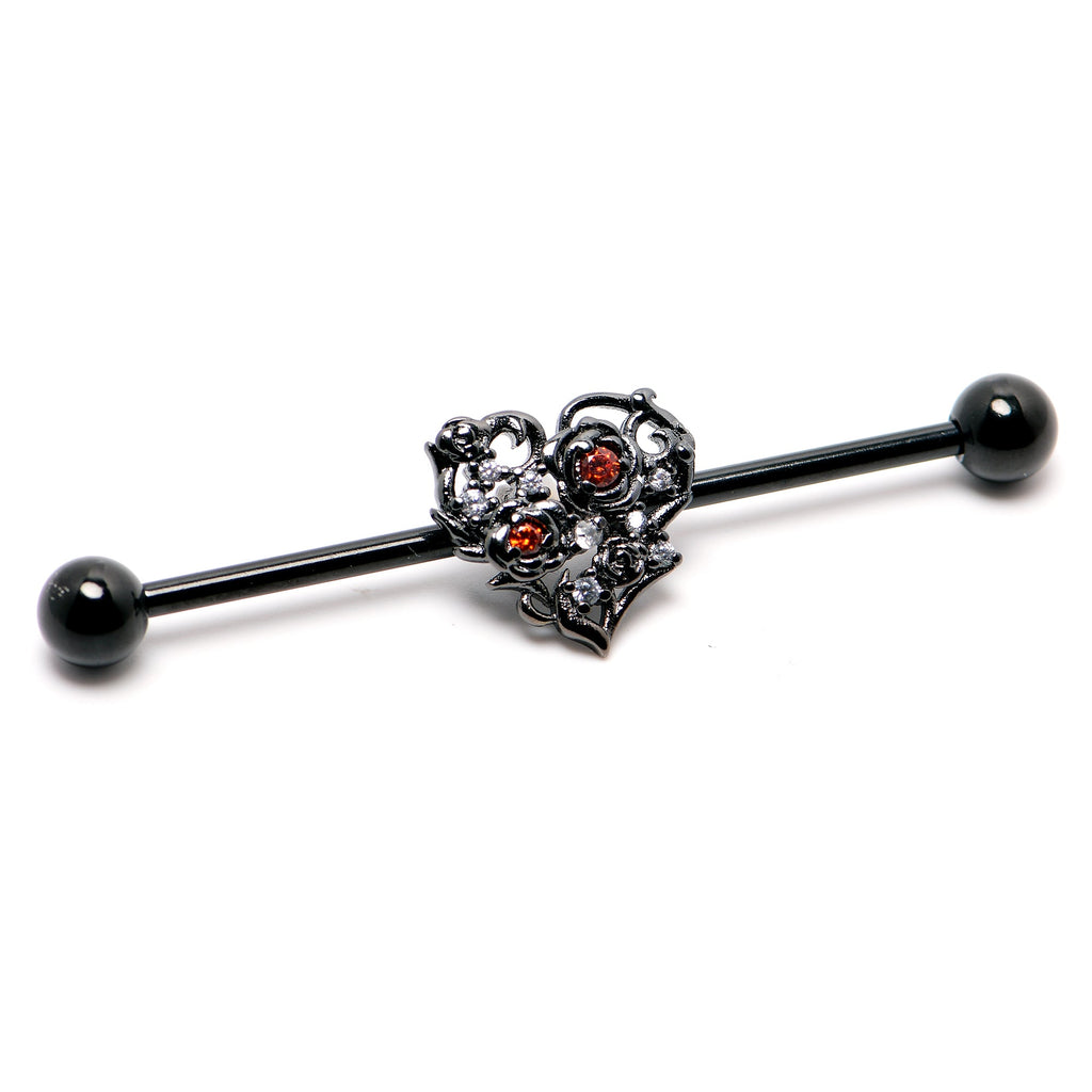 14 Gauge Clear Red CZ Gem Black Heart Floral Industrial Barbell 38mm