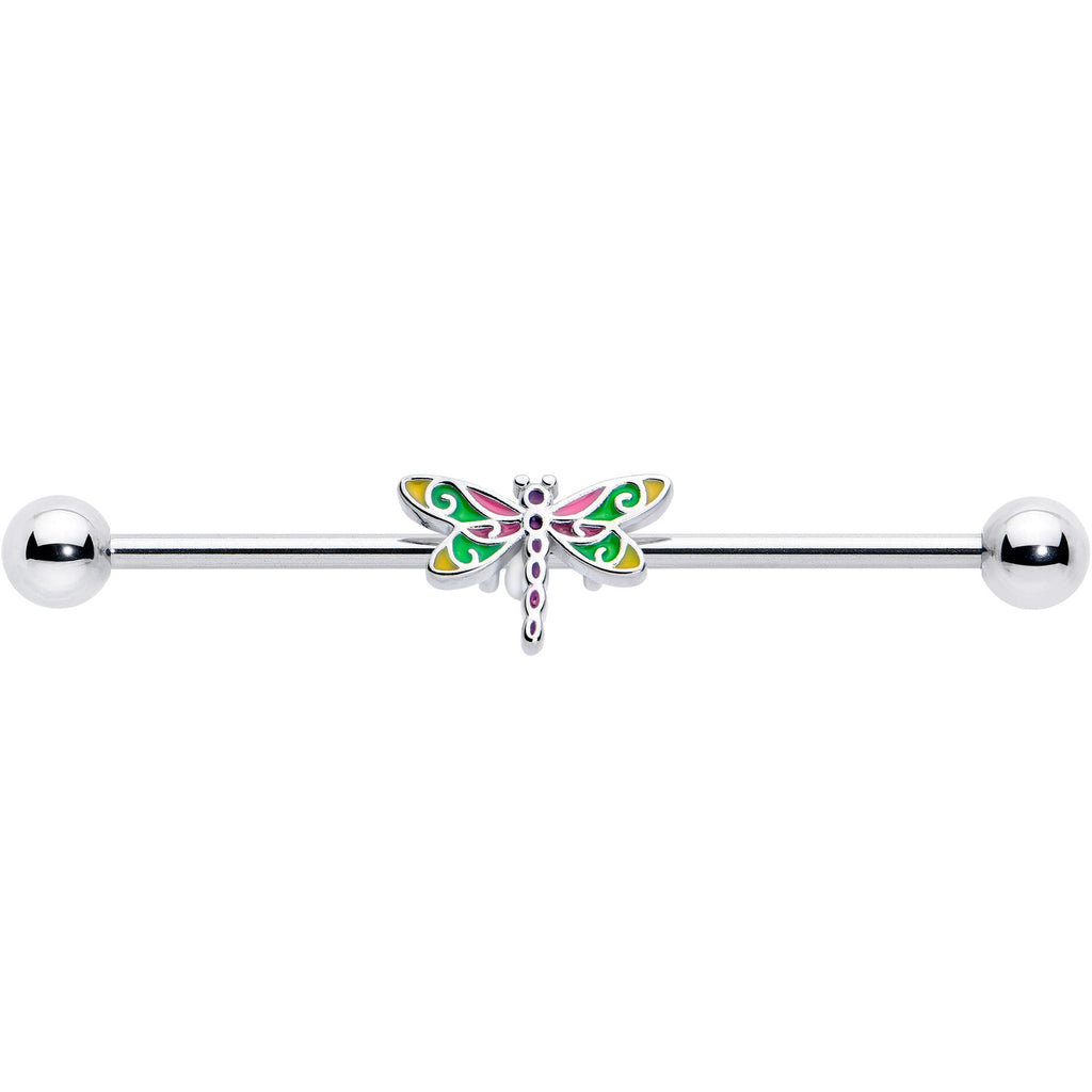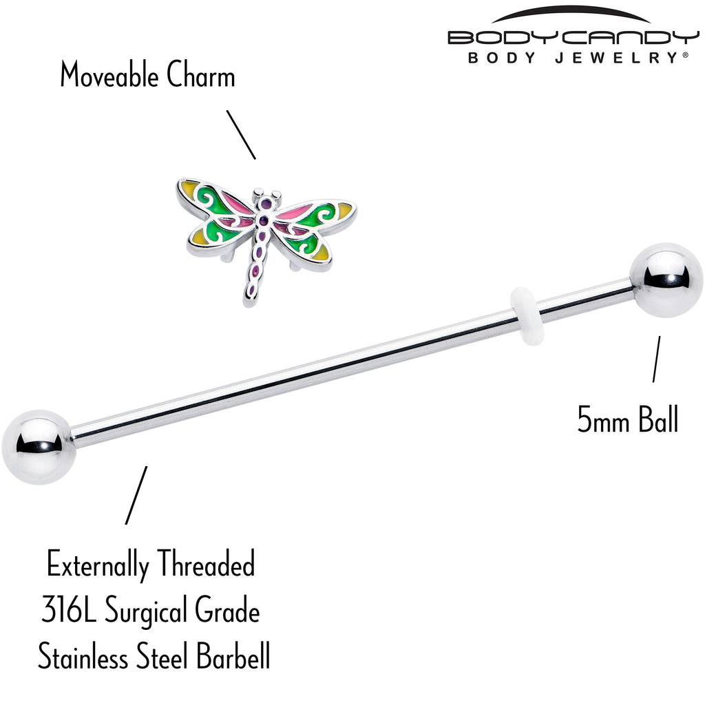 Let your look soar with style when you're rocking this 14 gauge helix barbell. It's made with a 1 1/2 inch 316L surgical grade stainless steel straight barbell with 5mm ball ends. It features a dragonfly charm, inlaid with green, yellow, pink and purple for a colorful look you can't miss and you can even slide it up and down the length of the barbell for the perfect look. Spread your wings and take flight with this colorful dragonfly barbell earring.