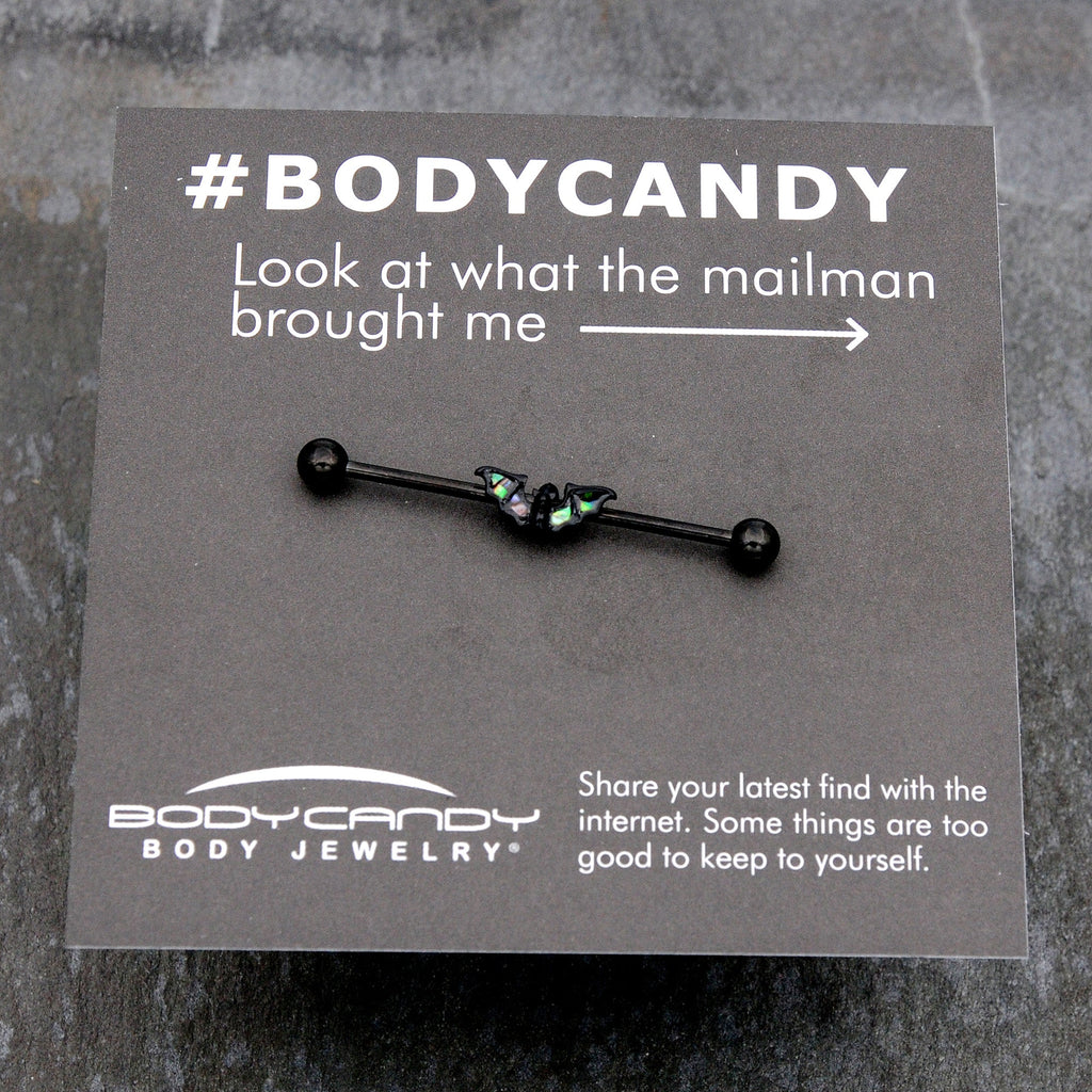 You would have to have bats in your belfrey not to fall in love with this 14 gauge bat-themed helix barbell. It is made with a 1 1/2 inch black PVD over 316L surgical grade stainless steel straight barbell with 5mm ball ends. It features a bat charm, set with subtle color embellishment in the wings. You can even slide it up and down the length of the barbell for the perfect look. You will want this bat barbell earring hanging around all year round.Specifications