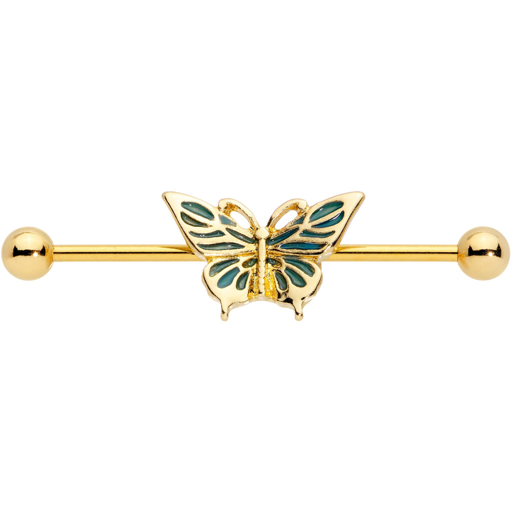 Go green and look beautiful doing it with this 14 gauge helix barbell! It's made with a 1 1/2" gold tone PVD over 316L surgical grade stainless steel straight barbell with 5mm ball ends. It features a butterfly charm with openwork designs on its wings. Underneath, green inlay adds color contrast and eye-catching detail to really set this piece apart from the crowd! And you can even slide the butterfly up and down the length of the barbell to get just the look you want. Lift up your industrial piercing from the ordinary with this beautiful butterfly barbell earring!Specifications