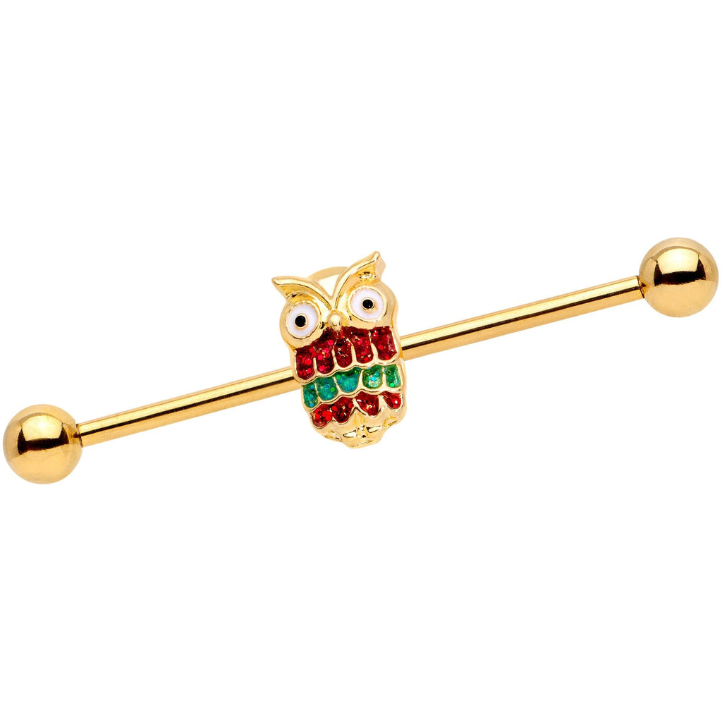 This little owl is an absolute hoot! This 14 gauge barbell earring is made with a 1 1/2" gold tone plated over 316L surgical grade stainless steel straight barbell with 5mm ball ends. He's inlaid with red and green with a glittery effect to make him look like he's wearing a brand-new holiday sweater. His eyes are accented with white and black inlay for extra visual punch as well. And this little owl is moveable and can be slid up and down the length of the barbell so he can get the best possible view of what's going on around him. He'd make a wise choice for your industrial piercing!Specifications