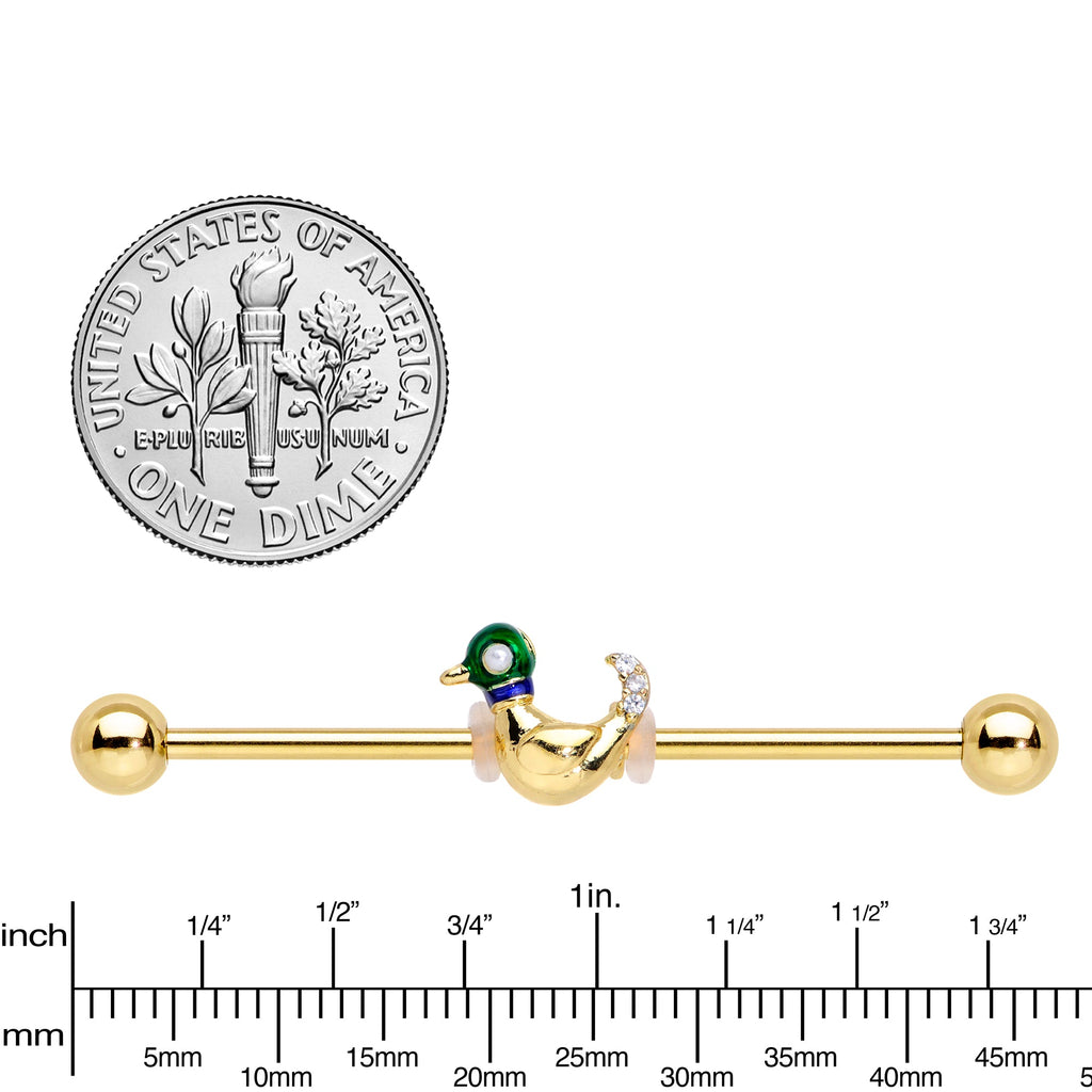 This tough little guy would rather hang out on your ear than paddle in a pond. At 14 gauge and 1 1/2" in length, industrial barbell is made with a gold tone PVD over 316L surgical gauge stainless steel straight barbell to handle whatever life tosses your way. The handsome moveable duck charm is inlaid with blue and green on his head, just like the real thing. But he's even better than a live duck because he has a striking looking white orb for an eye and is finished with a glitter inlaid tail for extra pizazz. This duck isn't just wild, he's absolutely quackers!Specifications