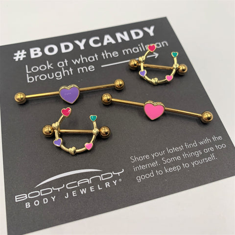 Give your industrial piercing a Valentine with this 14 gauge helix barbell! It's made with a 1 1/2" gold tone PVD over 316L surgical grade stainless steel straight barbell with 5mm ball ends. It features a simple pink heart charm. The overall appearance is colorful and whimsical and full of visual punch. You can even slide the heart up and down the length of the barbell to get just the look you love. Tell the world how much you love your industrial piercing with this vivacious valentine barbell earring!Specifications