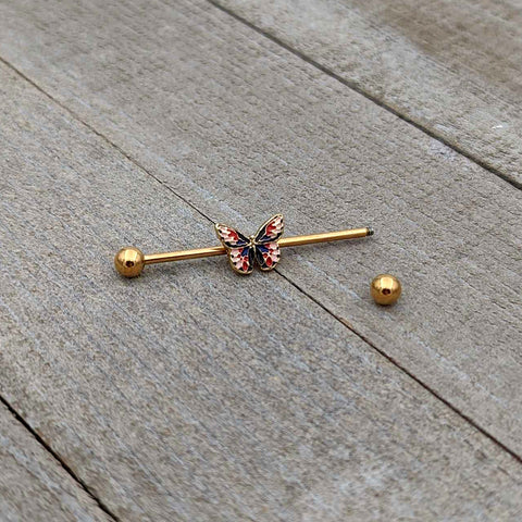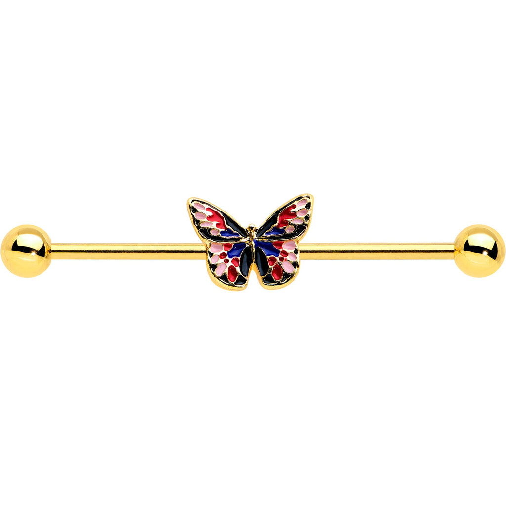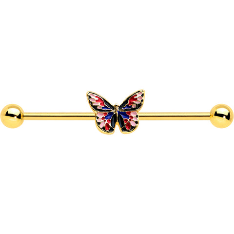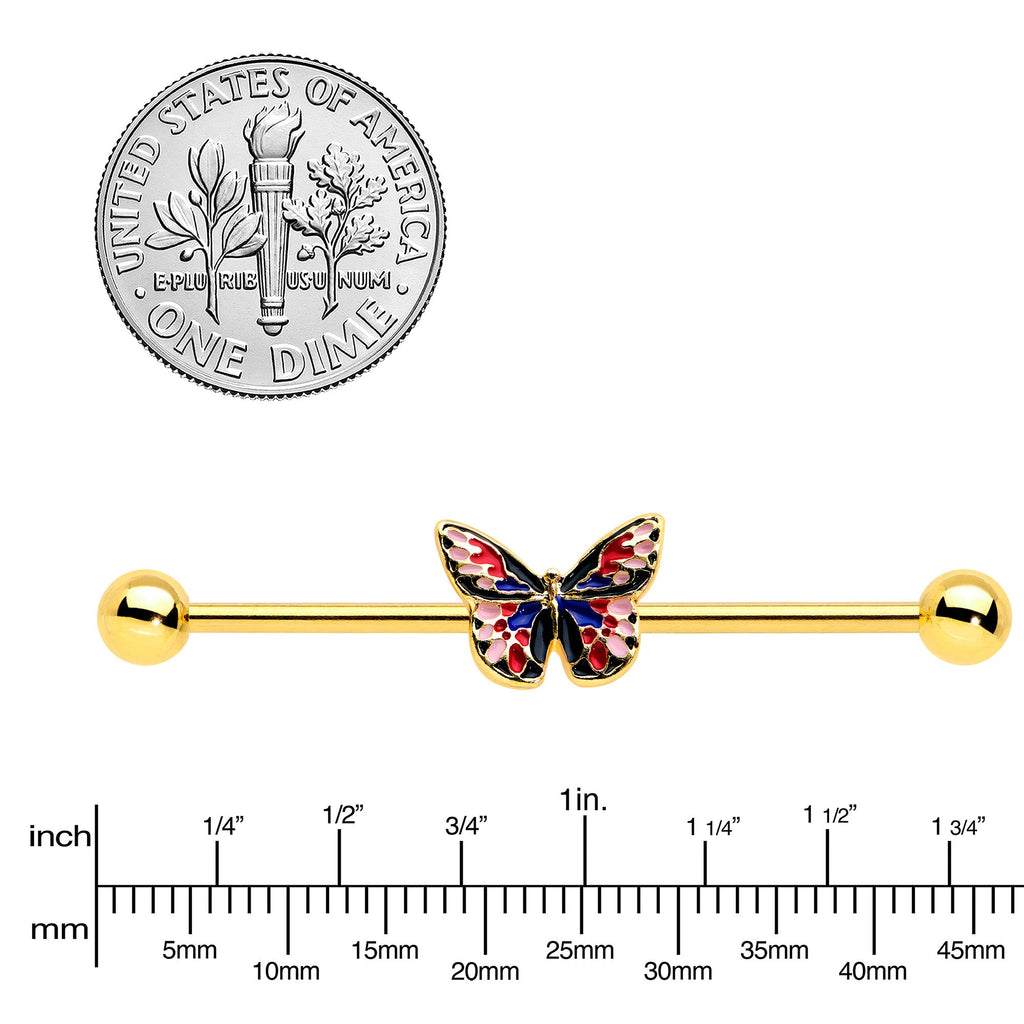 14 Gauge Gold Tone Red Blue Pink Butterfly Industrial Barbell 38mm