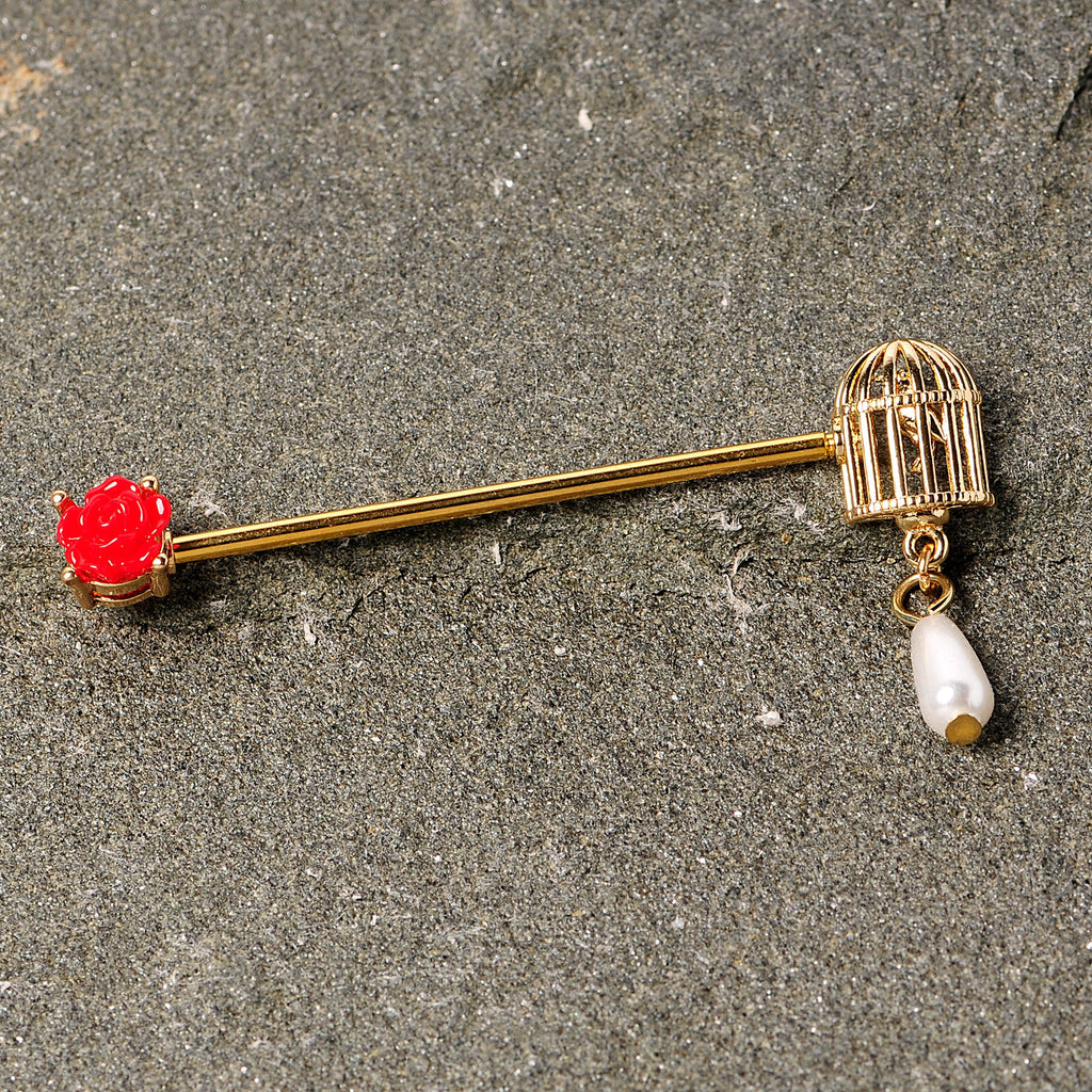 The vintage style of this 14 gauge helix barbell will make you want to sing! It's made with a 1 1/2" gold tone plated over 316L surgical grade stainless straight barbell. One end features a red acrylic rose charm and the other features a birdcage charm, complete with a tiny bird inside, with a pearlescent bead dangling from its base. Let a bird and a blossom bedecked barbell bedazzle everyone with this industrial barbell!Specifications