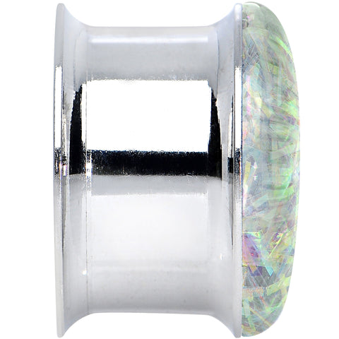 Hypoallergenic jewelry for sensitive skinItem sold individually, purchase two for a pair. It's always a party when this cool stainless steel ear expander plug comes out. Aurora opalescent glitter inlay on the front of the shiny 16mm silver tone double flare saddle plug creates super sparkle. Pierced body jewelry ear gauge plug.