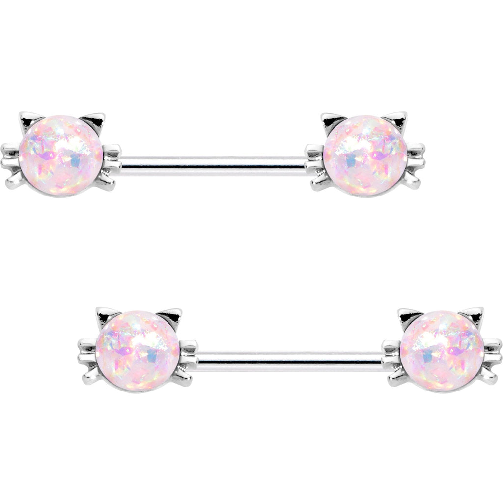 Meow, purr, purr. Now you can be a kitty too! Or at least show off your love for kitties with these 14 gauge kitty cat inspired, white faux opal barbell nipple piercings. A large central white faux opal is decorated with cute kitty whiskers and ears on each end of this cute nipple jewelry. The charms are mounted on 16mm in length straight barbells made with 316L surgical grade stainless steel.