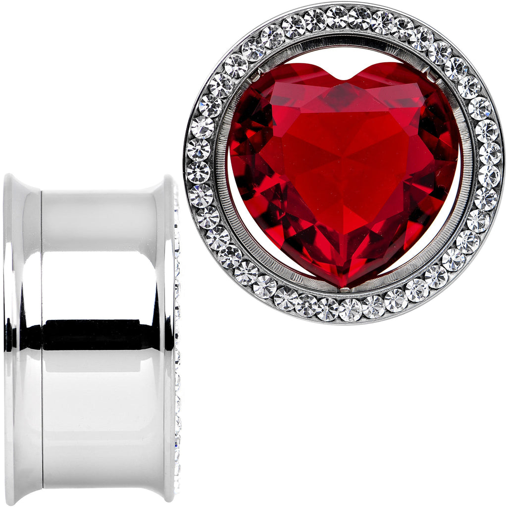 This 7/8" 316L surgical grade stainless steel screw fit double flare plug featuring a red heart insert encircled by clear gems is a must-have for any plug jewelry wearer who is looking for something that adds a flash of feminine style. This gauge is internally threaded for easy insertion. Sold in set of two.