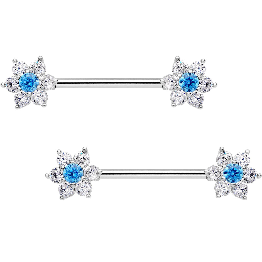 9/16" Aqua CZ Gem Summer Flower Petal Barbell Nipple Ring Set