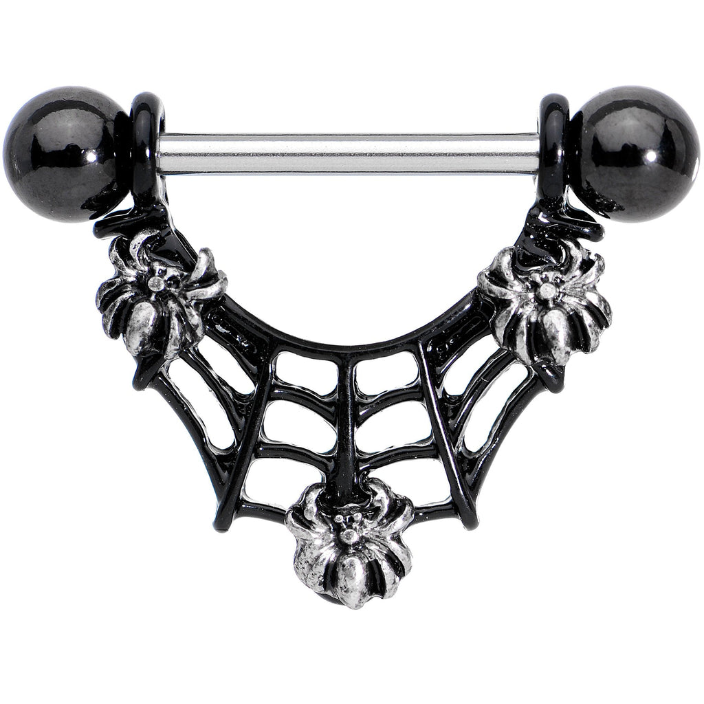If scary Halloween creatures leave your nerves hanging by a thread then look out! This pair of creepy 14 gauge nipple piercings might give you nightmares. Made with 14mm durable 316L surgical grade stainless steel straight barbells, this nipple jewelry features spiderweb shield dangles, each set with three tiny spiders! This pair of terrifying barbell nipple rings is sold as a set of 2 for you. Boo!