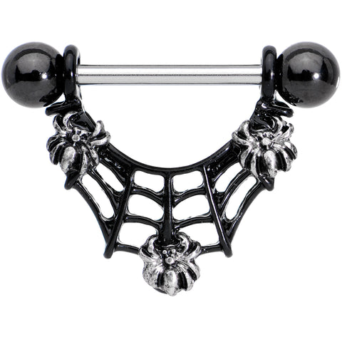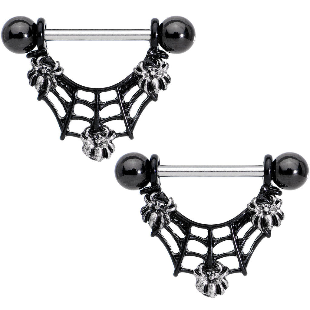 9/16" Black Baby Spiders on Web Halloween Dangle Nipple Ring Set