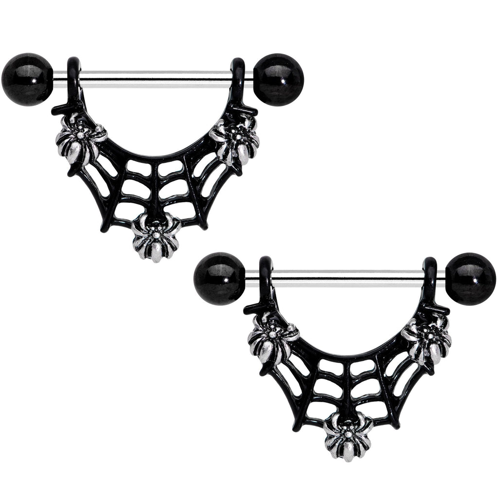 If creepy crawlies are your favorite, then this dangle barbell nipple ring set is right up your spider web-covered ally. These 14 gauge nipple piercings are covered in black spider webs and little metalwork spiders. The spider charms dangle from a pair of 14mm straight barbells made with durable 316L surgical grade stainless steel, complete with 5mm black IP ball ends. This Halloween nipple jewelry is sold as a set of two for you.