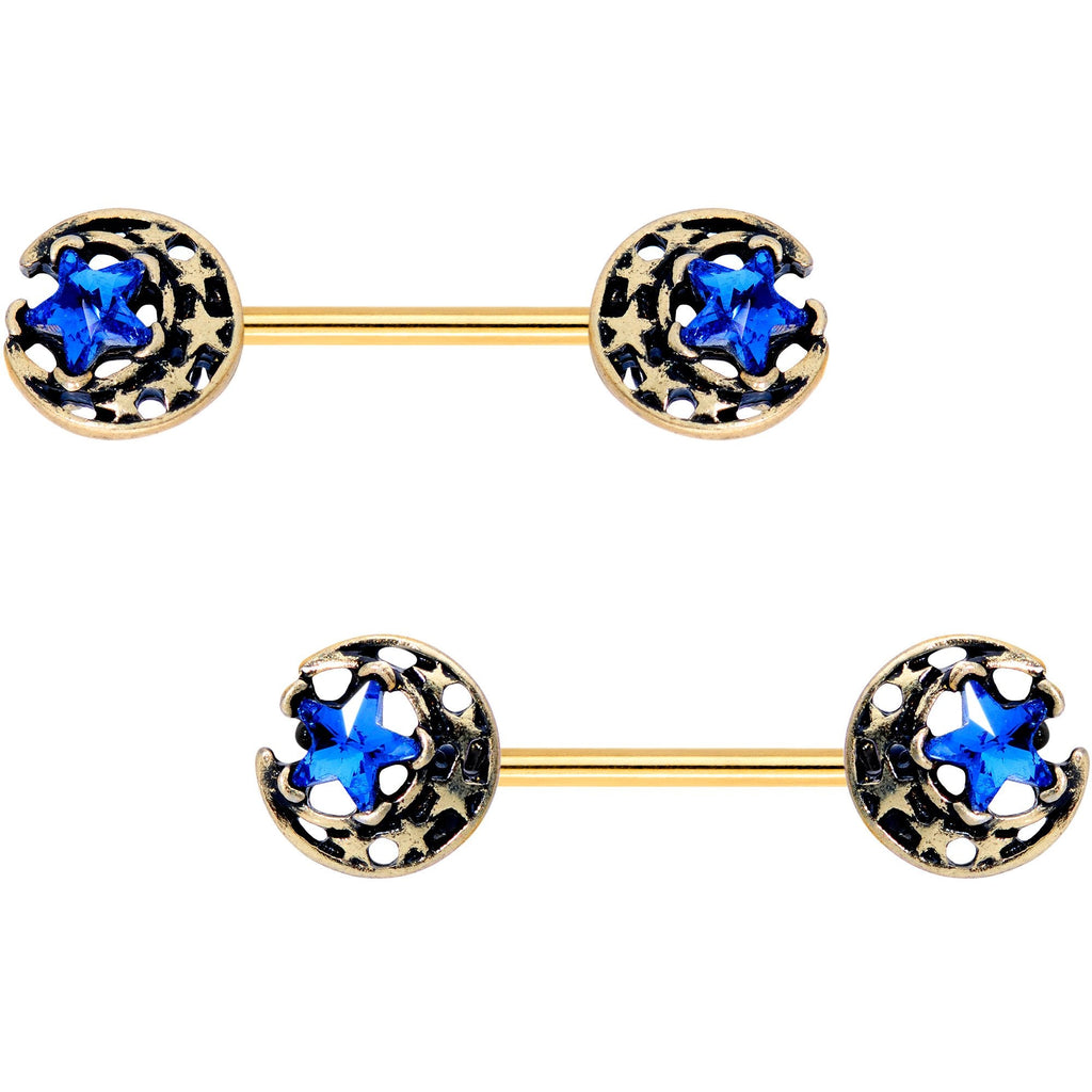Nothing is as beautiful as the night sky. Wear your favorite celestial objects on you all the time with this cute pair of star and moon nipple barbells. A blue star-shaped gem sits in the crescent of these star-studded moon charms on these 14 gauge nipple rings. The star and moon charms are mounted on a pair of 9/16" straight barbells made with gold PVD over 316L surgical grade stainless steel. Sold as a set of two for you!Specifications