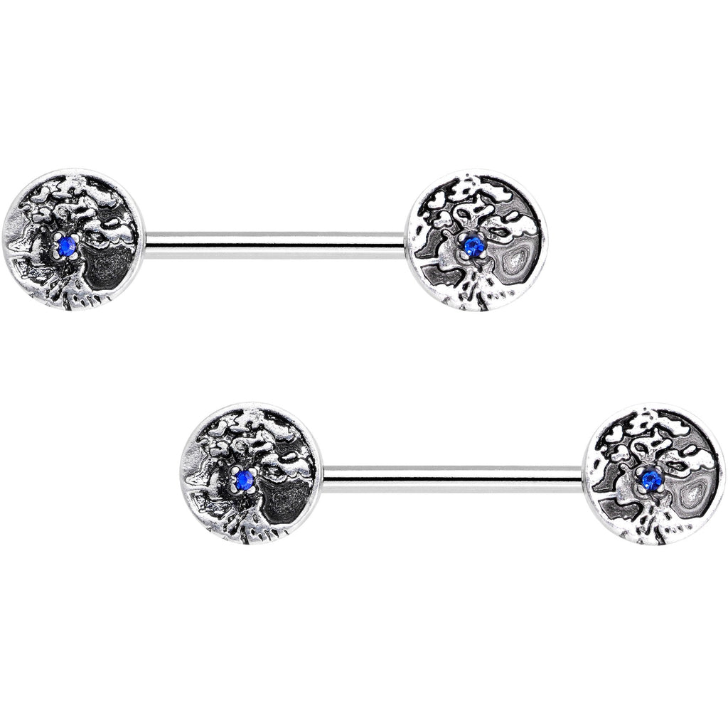 The tiny blue gems on these interesting barbell nipple rings look like they're creating a ripple effect in a vast pool of water! The deep blue gems on these 14 gauge barbell nipple rings are set on a metalwork water-inspired design and mounted on a pair of 14mm straight barbells made with durable 316L surgical grade stainless steel. Sold as a set of two for you!Specifications