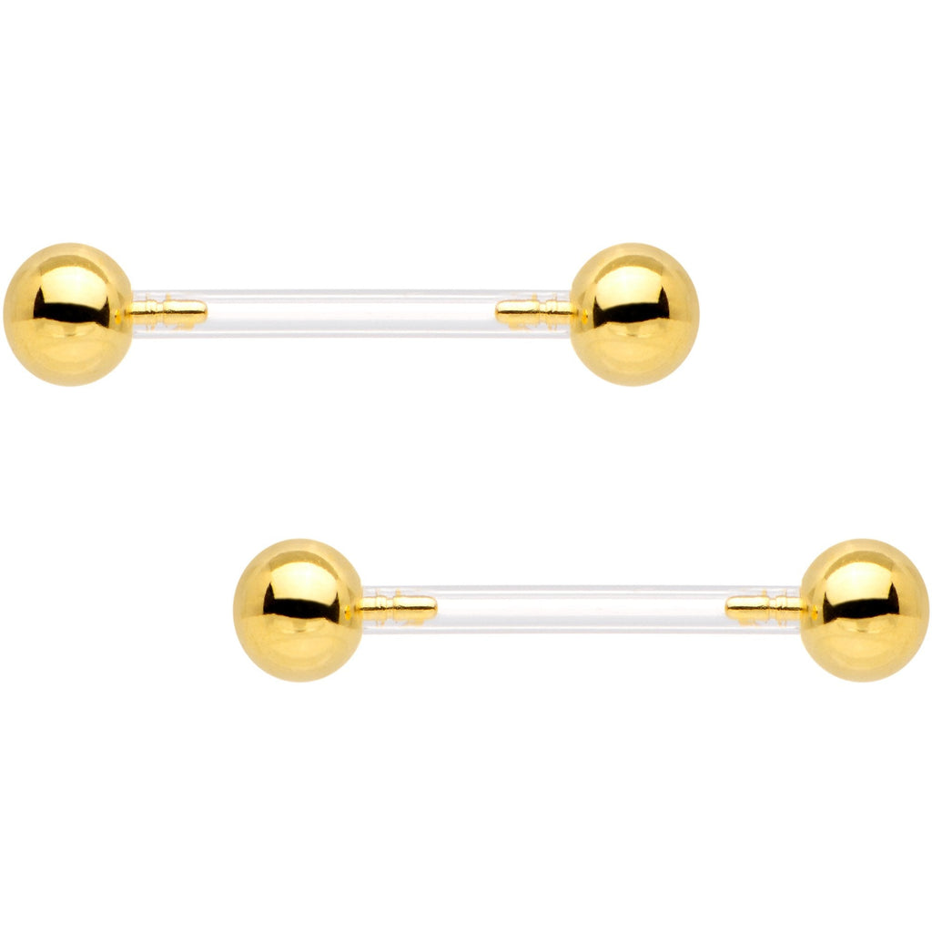 Whether you're looking for a more discrete look or you just want to up your piercing comfort level, you're all set with this pair of 14 gauge barbell nipple rings with eye-catching gold tone ball ends that will always have your nipple piercings looking on point! The 14mm length straight barbell used in this set of nipple jewelry is made from safe and flexible clear Bioplast and beautiful gold tone push in ends. Sold as a pair, this set of nipple rings is more than ready to make their way into your pierced nipples for a style that will bring low-maintenance glamour to any situation.
