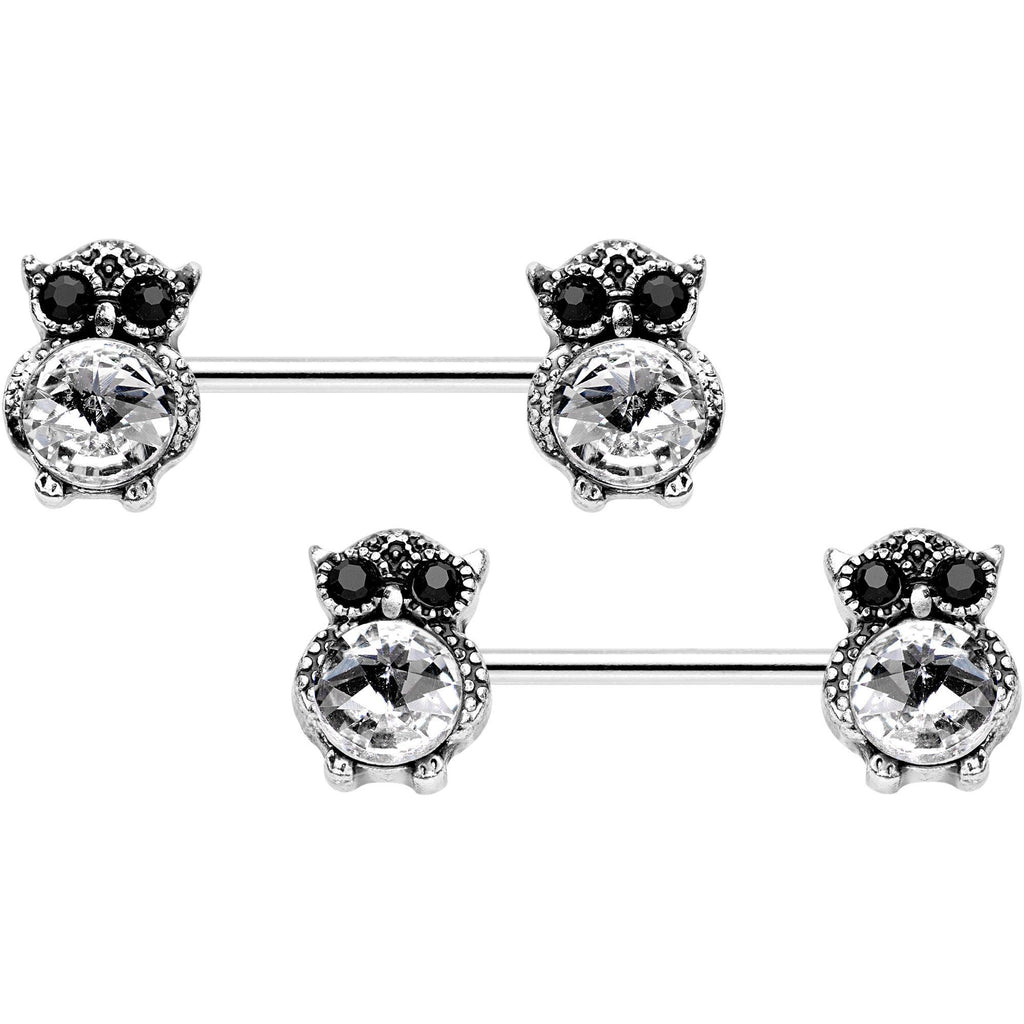 Whether you think owls are cute or spooky, there's no doubt these nipple rings are awesome! Made with 14mm durable 316L surgical grade stainless steel straight barbells, this set of nipple barbell piercings features black-eyed owl charms made with clear gems mounted on either end. Sold as a set of two for you!