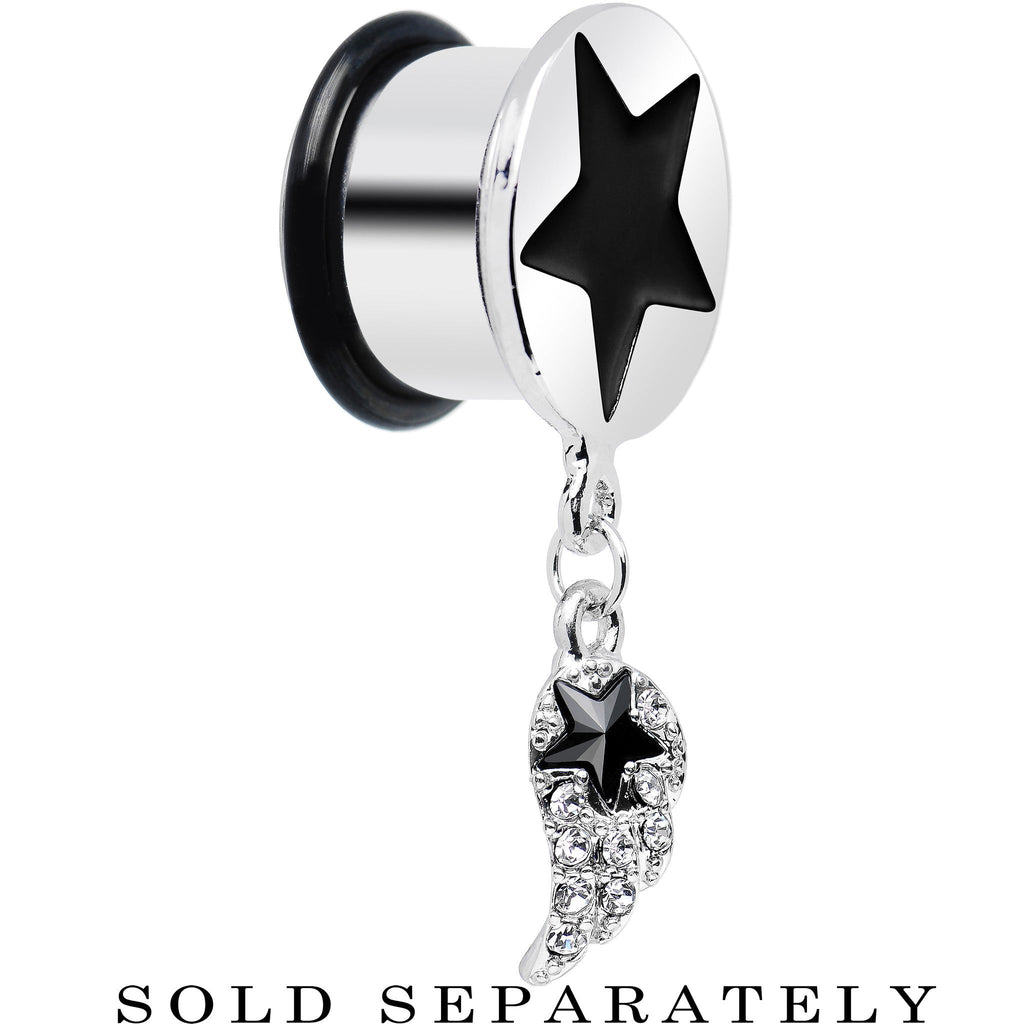 Item sold individually, purchase two for a pair. Always have the power of an angel nearby with this 14mm stainless steel dangle plug. Not only does the single flare ear stretcher have a dangling clear gem wing with a brilliant black gem star in its center, it also features a black five-pointed star topper. Pierced ear expander ear gauge tunnel plug includes one rubber O-ring.
