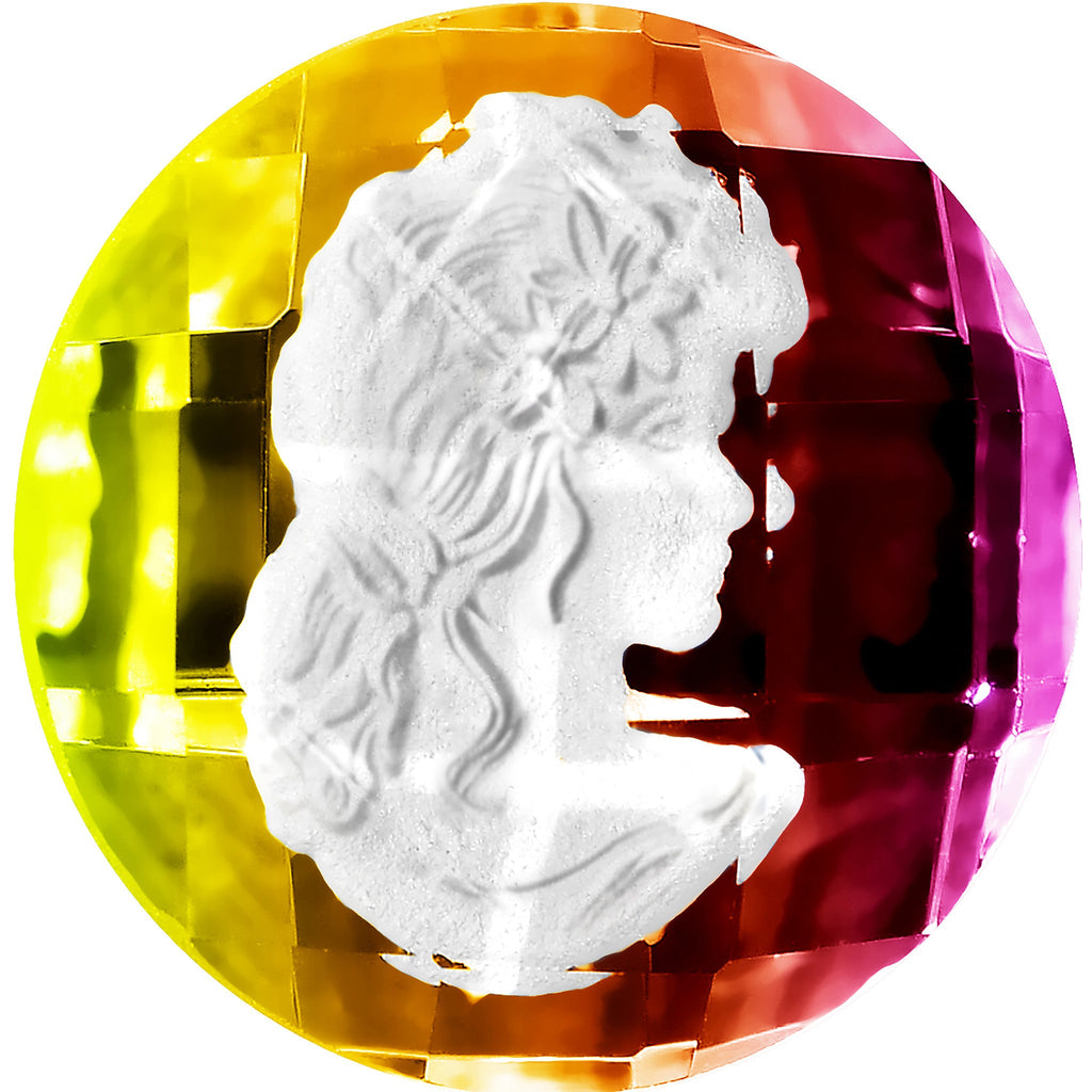Hypoallergenic jewelry for sensitive skin.Sold Individually, purchase 2 for a pair. This 14mm ear stretcher saddle plug is a riot of color and style, thanks to a classic white cameo with rainbow background. Faceted acrylic overlay with a vintage style cameo inlay creates this Victorian plug.