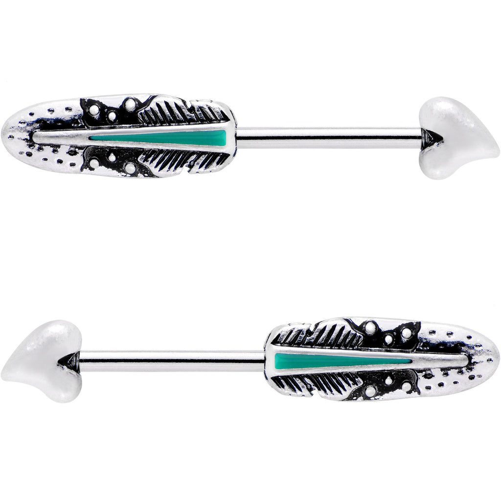 Make your breasts feel like a decorated dream when you wear this pair of 14 gauge nipple piercings. Made with 14mm durable 316L surgical grade stainless steel straight barbells, this nipple jewelry set features a pretty heart end on one side, southwestern style feather ends on the other decorated with faux turquoise detail, and is sold as a set of two. Whether you are into beautiful, eye-catching fashions or southwestern style this barbell nipple ring set will make your girls look dangerously good!