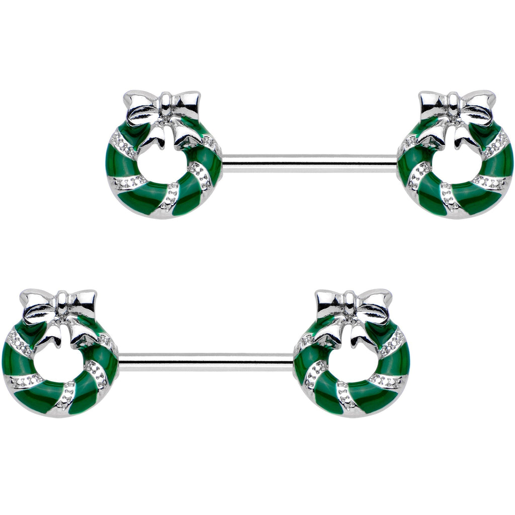 9/16 Minty Green Christmas Candy Cane Wreath Barbell Nipple Ring Set