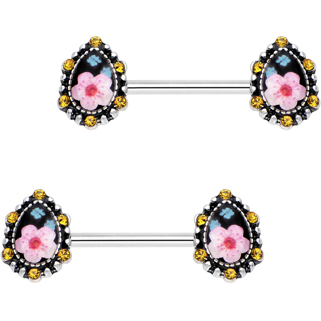 9/16" Orange Gem Framed Flower Brooch Barbell Nipple Ring Set