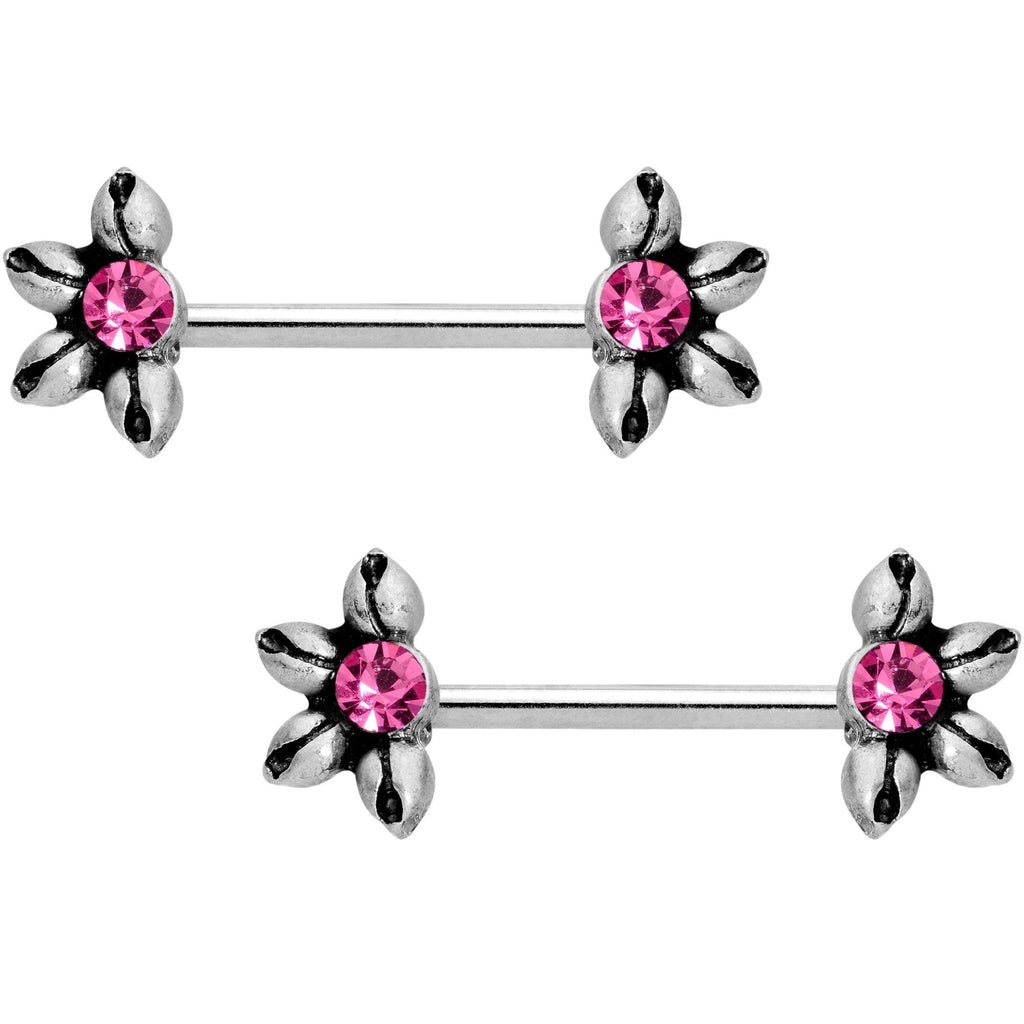 Show off your love of nature's treasure when you wear this fun pair of 14 gauge barbell nipple rings. Made with a pair of 9/16" durable 316L surgical grade stainless steel straight barbells, these nipple rings feature a pair of blooming, unfurling half flower charms, each with a pink cubic zirconia gem center. Perfect for any fashion style! Sold as a set of two.