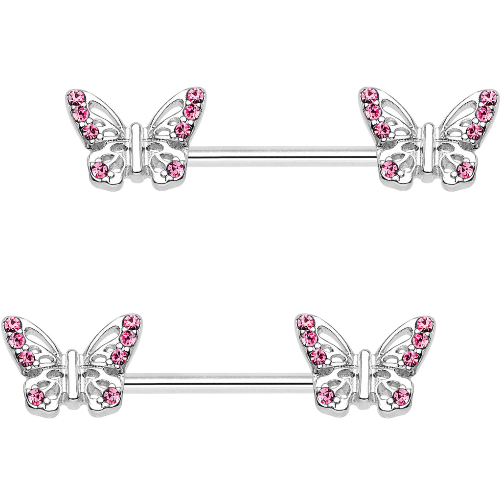Butterfly lovers will feel their heart flutter when wearing this pretty set of 14 gauge butterfly nipple barbell rings. Each end of these 9/16" straight barbells made with durable 316L surgical grade stainless steel features a pretty 8mm butterfly charm with wings accented by a set of pink cubic zirconia gems. Sold as a set of two for you!