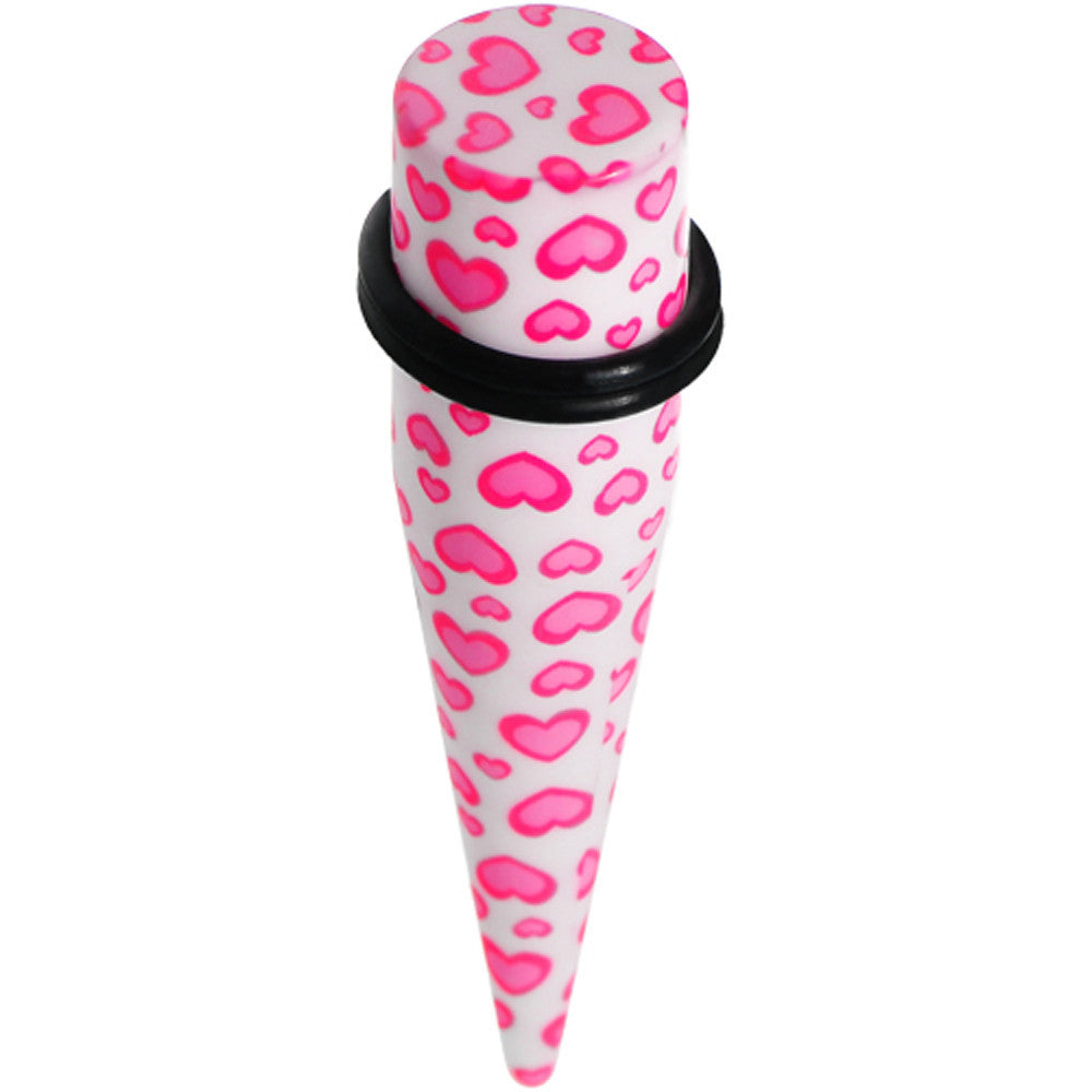 Hypoallergenic jewelry for sensitive skin.Sold individually, Please purchase a quantity of 2 for a pair. 14mm taper ear plug. White acrylic straight taper with cute pink heart print design. Heart taper ear expander.
