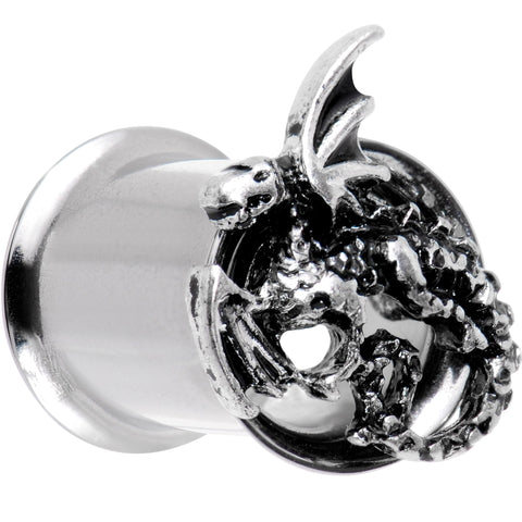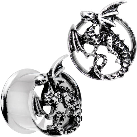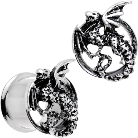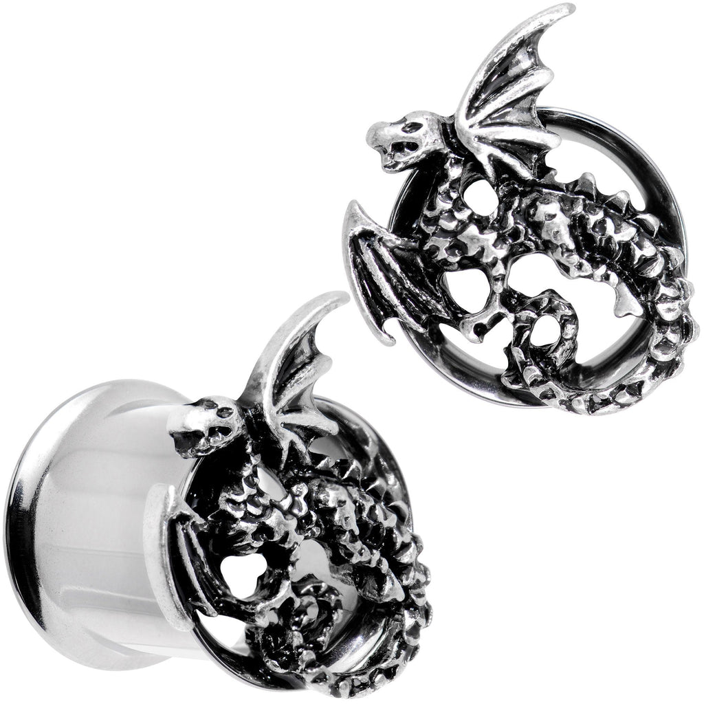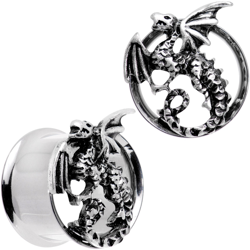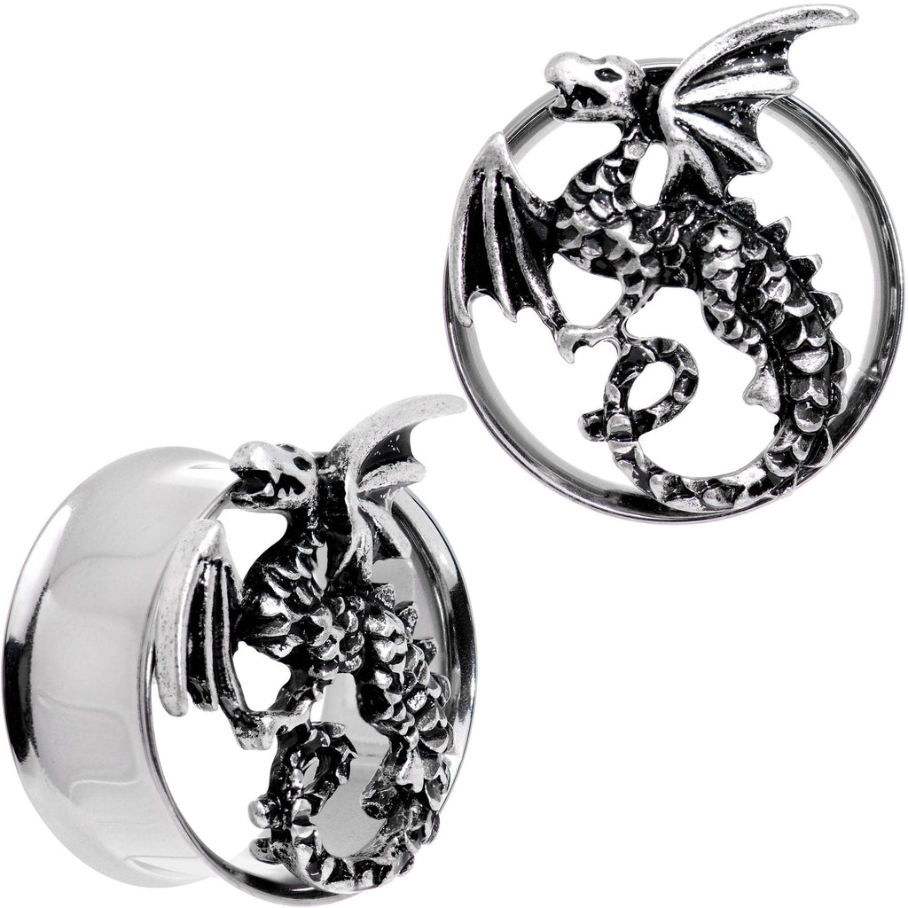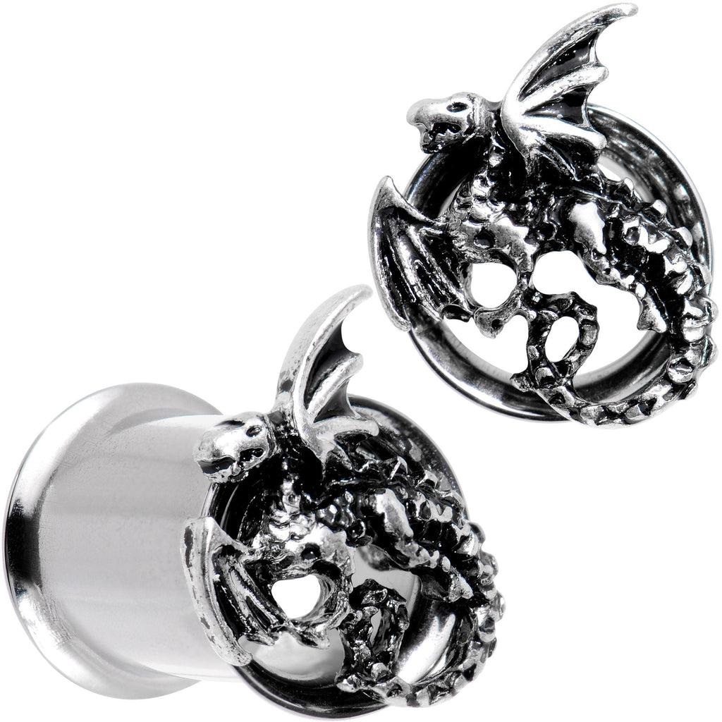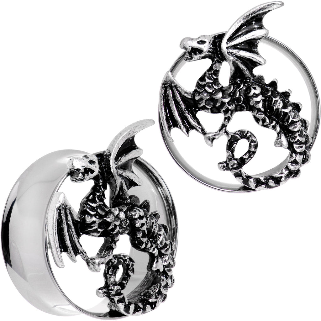 Rawr, this fearsome dragon is fierce! Now you can channel his fierceness with this pair of intense dragon plugs. Made with durable 316L surgical grade stainless steel, these tunnel plugs feature a a front dragon charm and are made in a double flare style for secure wear. Sold as a set of two for you! NOTE: Prices of plugs may vary based on plug ear gauge size selected from drop down. Specifications