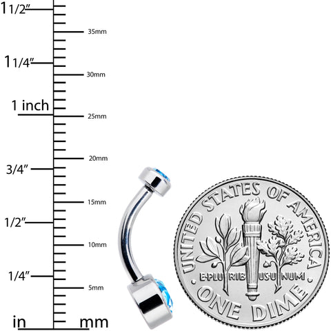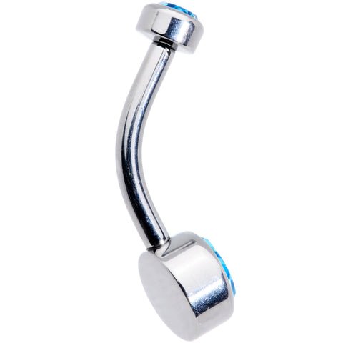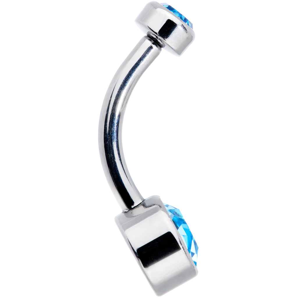 Keeping it simple doesn't mean keeping it boring or sacrificing quality with this 14 gauge navel ring! It's made with a 3/8" solid grade 23 implant grade titanium curved barbell. The 4mm top end and 6mm bottom end feature aqua crystals created with Crystals. It's also internally threaded for super comfortable insertion and removal. If you want to add some color and glamour to your belly piercing but keep an elegant appearance, this belly button jewelry has everything you need in one beautiful, comfortable package!