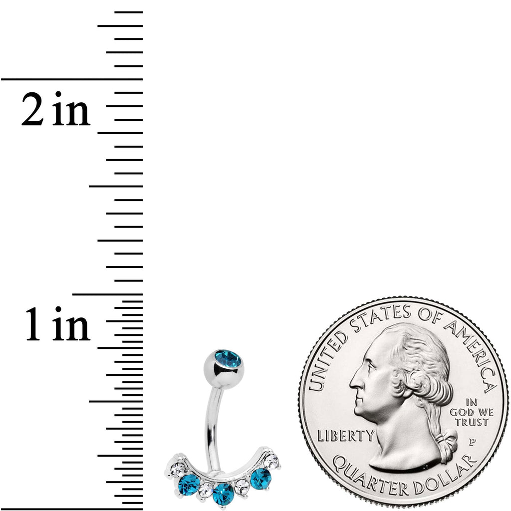 Get swept away in a wave of aqua and clear cubic zirconia gems with this stunning 14 gauge navel ring. It's 3/8", has an aqua cubic zirconia gem on the top and is finished by a row of alternating blue and clear cubic zirconia gems at the bottom - the kind of carefully designed details that will have everyone checking out your piercing AND you! Made with a durable 316L surgical grade stainless steel curved barbell, this belly ring is both beautiful and built to last...just like you are!