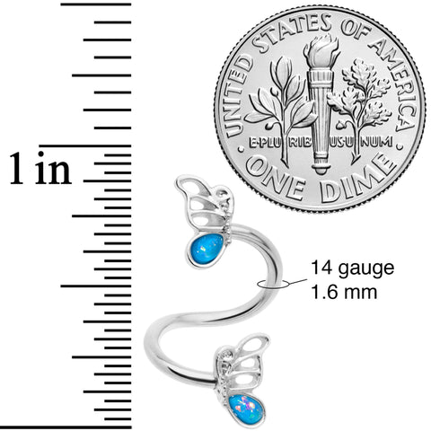 Give your piercing a pair of beautiful butterfly wings with this 14 gauge spiral belly button ring! It's made with a 10mm durable 316L surgical grade stainless steel spiral curved barbell. The ends feature butterfly charms, each set with a blue faux opal. This style of spiral body jewelry works beautifully in multiple piercings including some eyebrow and lip piercings, navel piercings, and cartilage piercings like the helix and more. So let this twister ring fly to the piercing of your choice - this spiral twister ring is bound to beautify it!Specifications