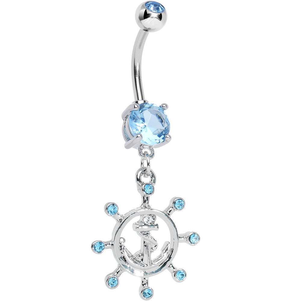 Ahoy there, maties! Never were there a dangling nautical belly button ring so full of oceanfaring glimmer as this. With a row of light blue gems surrounding the ship's wheel and a larger aqua prong set gem on the navel ring's barbell, setting sail is a fashionable business indeed.