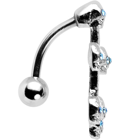 Sinister and stunning, this top mount gothic cross belly button ring is decorated with a series of skulls that feature eyes sparkling with aqua gems. A stainless steel curved barbell completes this piece.