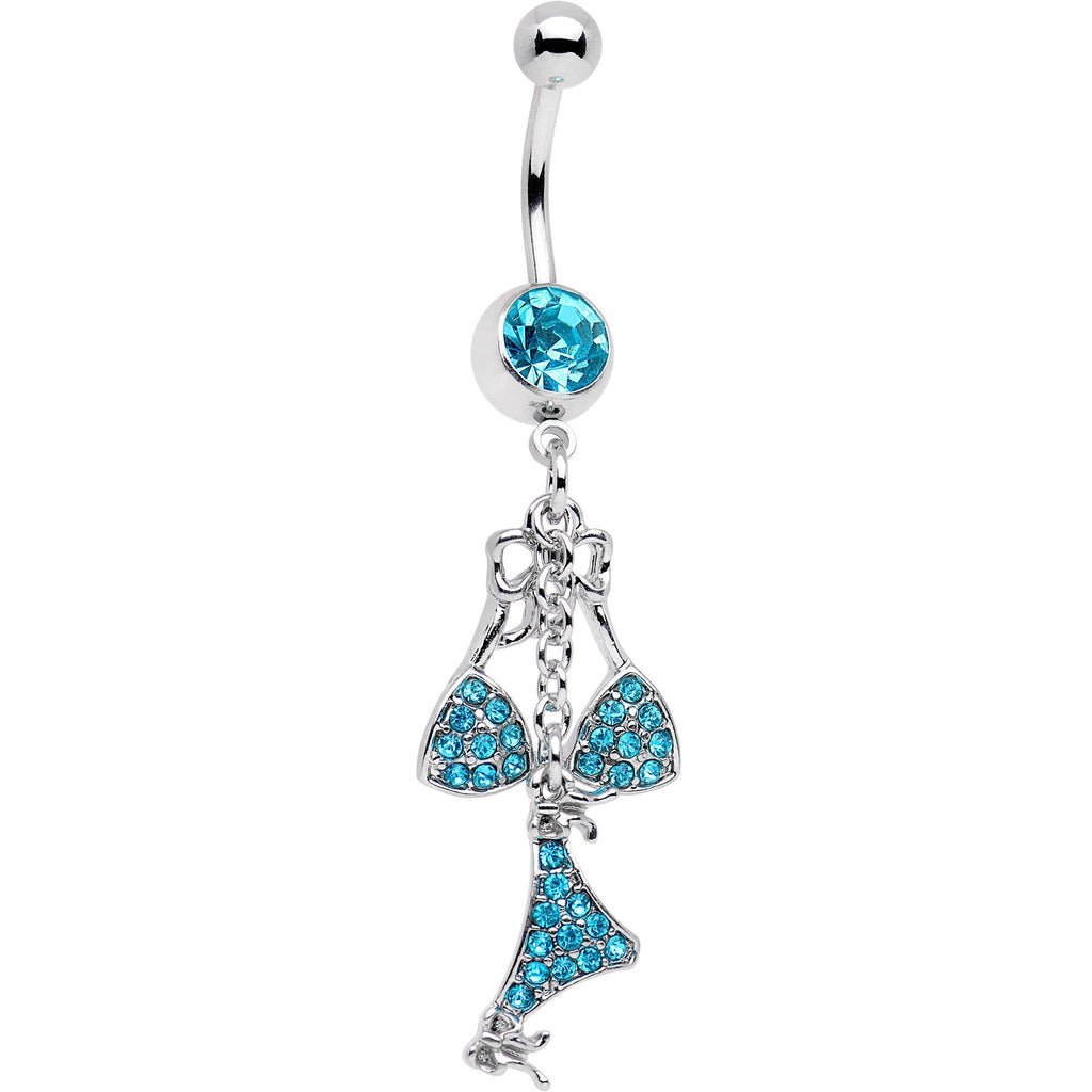 This unique 14 gauge belly piercing features an unraveled bow dangle design decorated with a whole slew of aqua gems. The bow-dangle design is mounted on a 3/8" curved barbell made with durable 316L surgical grade stainless steel. The curved barbell is decorated with a bottom aqua gem for that extra bit of beauty.