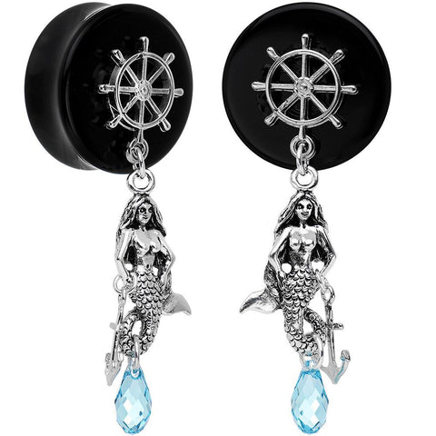 Set your sails and embark on a quest with some help from a seafaring maiden with this pair of handcrafted saddle plugs. The lightweight solid black acrylic base of the saddle plugs make for an easy and inexpensive way to insert and remove from your stretched lobes with the security found with double flare designs. And of course, the dangling design featuring a beautiful mermaid charm along with an aqua crystal teardrop and nautical details including an anchor charm and a ship's steering wheel on the face of the plugs makes for a truly oceanic style that will be your own buried treasure within your stretched ears. Available in sizes 00 Gauge (10mm) to 1" (25mm).