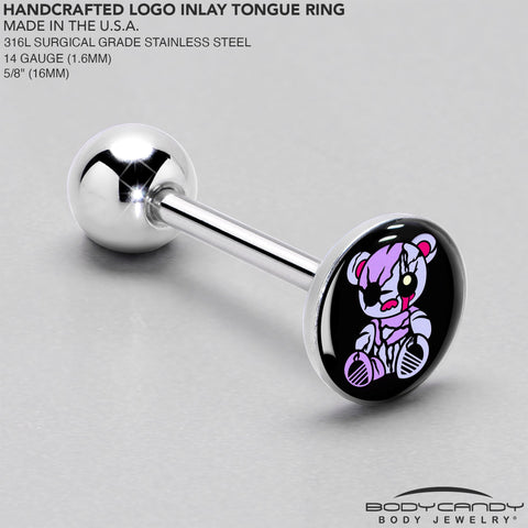 This teddy bear is cuddly cute with an edge on this 14 gauge tongue ring. It's made with a 5/8 inch durable 316L surgical grade stainless steel straight barbell with a 6mm bottom ball end. The top end features a black disc charm with a purple teddy bear. The teddy bear is scarred and missing an eye for a look that full of edgy attitude you can't help but want to cuddle. Give your look a stylish snuggle with this punk teddy bear tongue piercing jewelry.