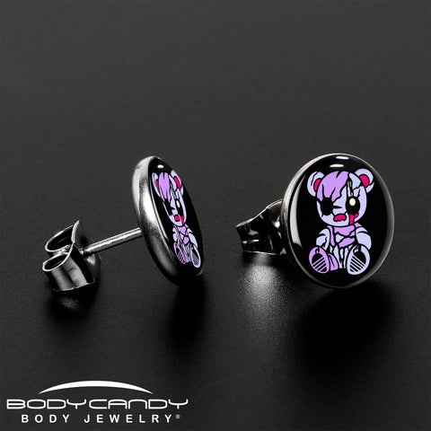 These teddy bears are cuddly cute with an edge on these stud earrings for pierced lobes. They're made with stainless steel straight posts with friction backs for a secure fit. Each one features a black disc charm with a purple teddy bear. The teddy bears are scarred and missing an eye for a look that full of edgy attitude you can't help but want to cuddle. Give your ears a stylish snuggle with these punk teddy bear earrings. Sold as a set of two.